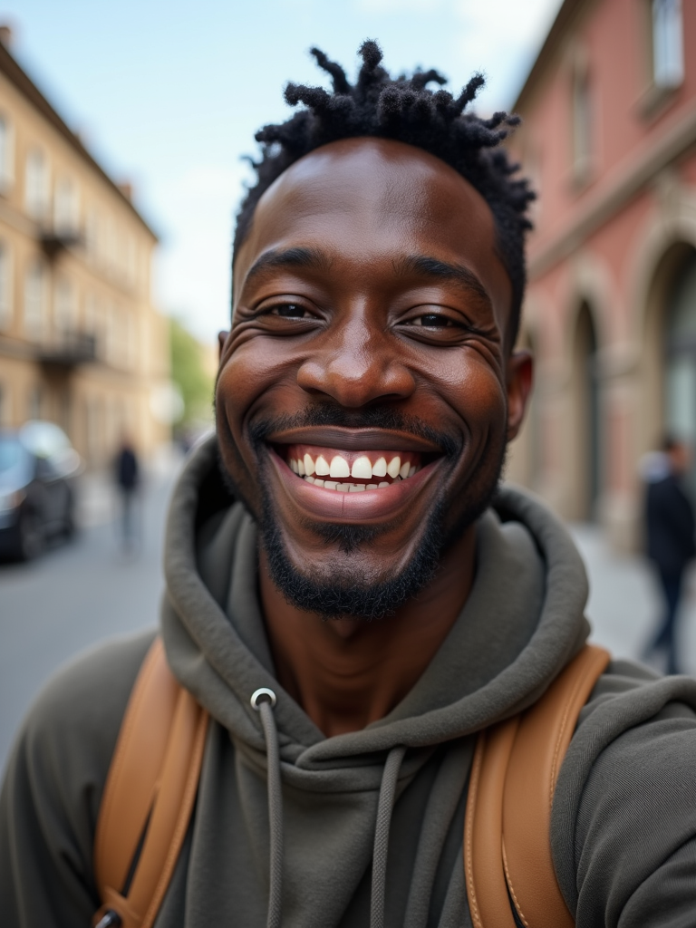 sincere masculine model snapping a selfie on a casual day out, with a genuine smile