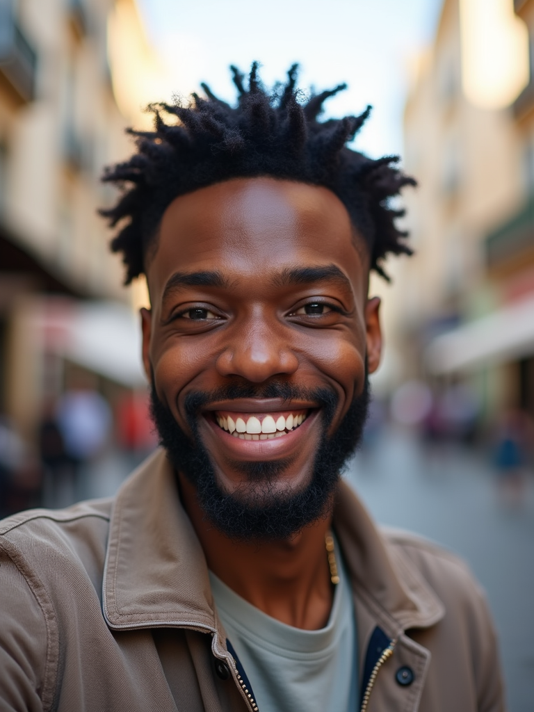 sincere masculine model snapping a selfie on a casual day out, with a genuine smile