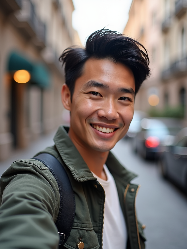 sincere masculine model snapping a selfie on a casual day out, with a genuine smile