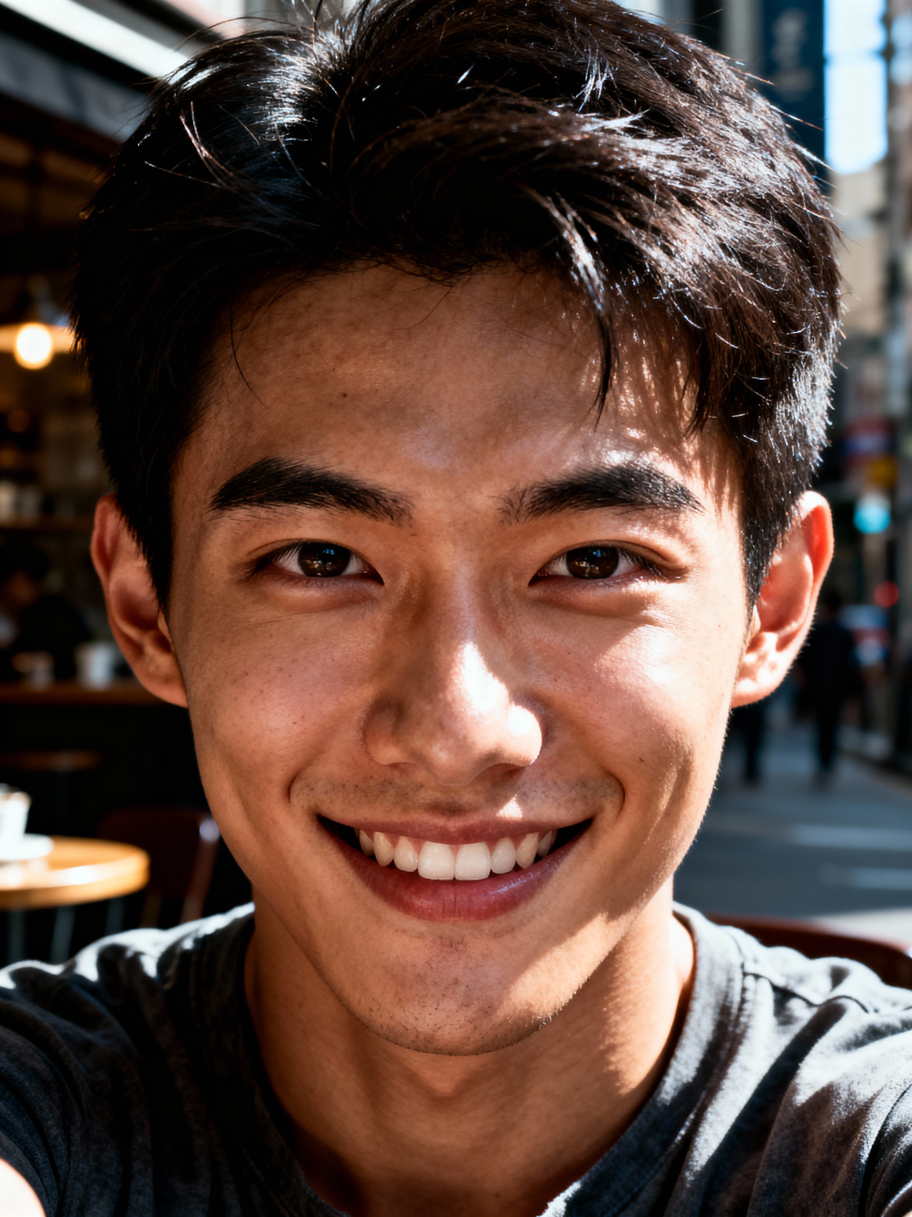 sincere masculine model snapping a selfie on a casual day out, with a genuine smile