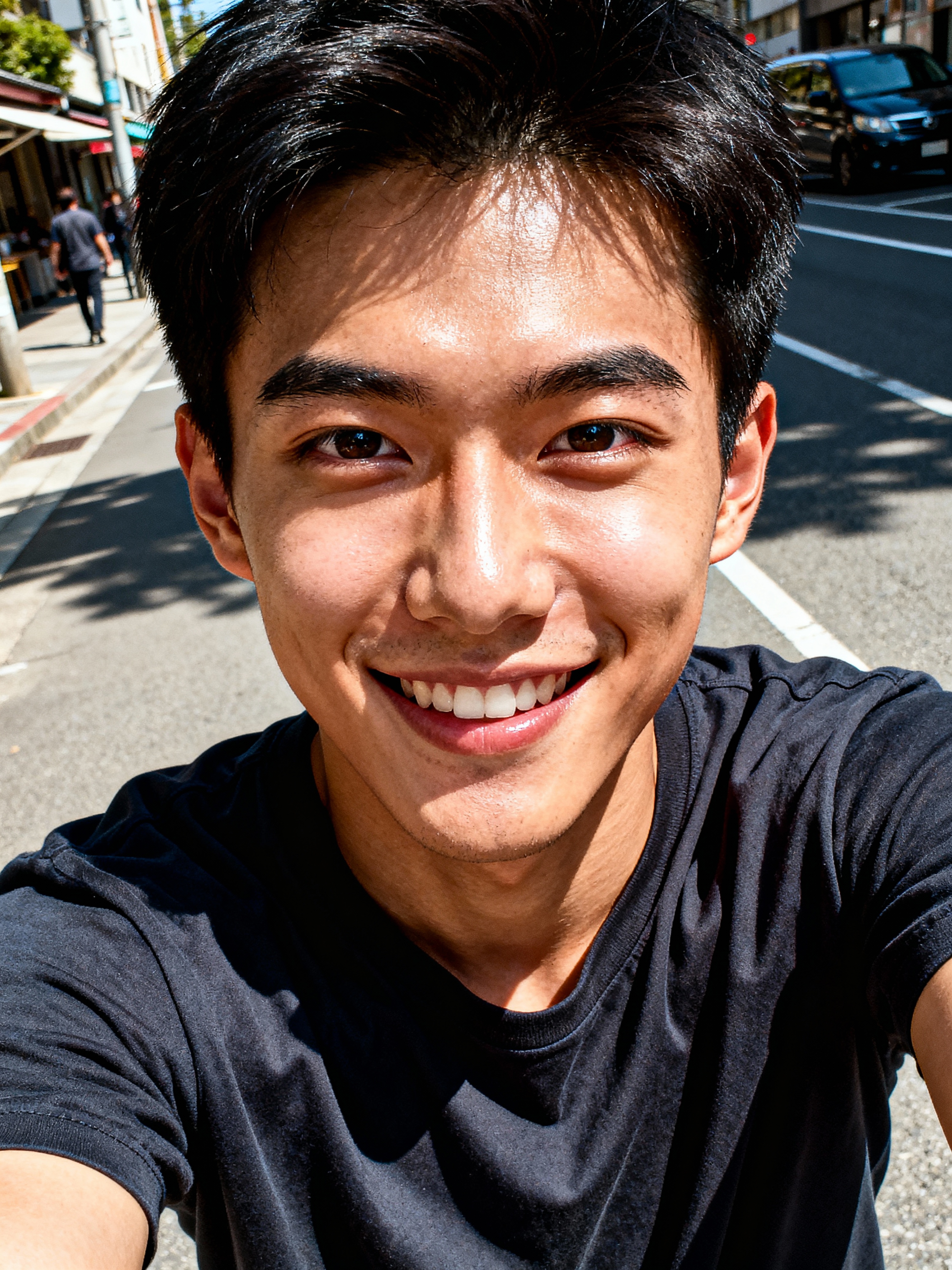 sincere masculine model snapping a selfie on a casual day out, with a genuine smile