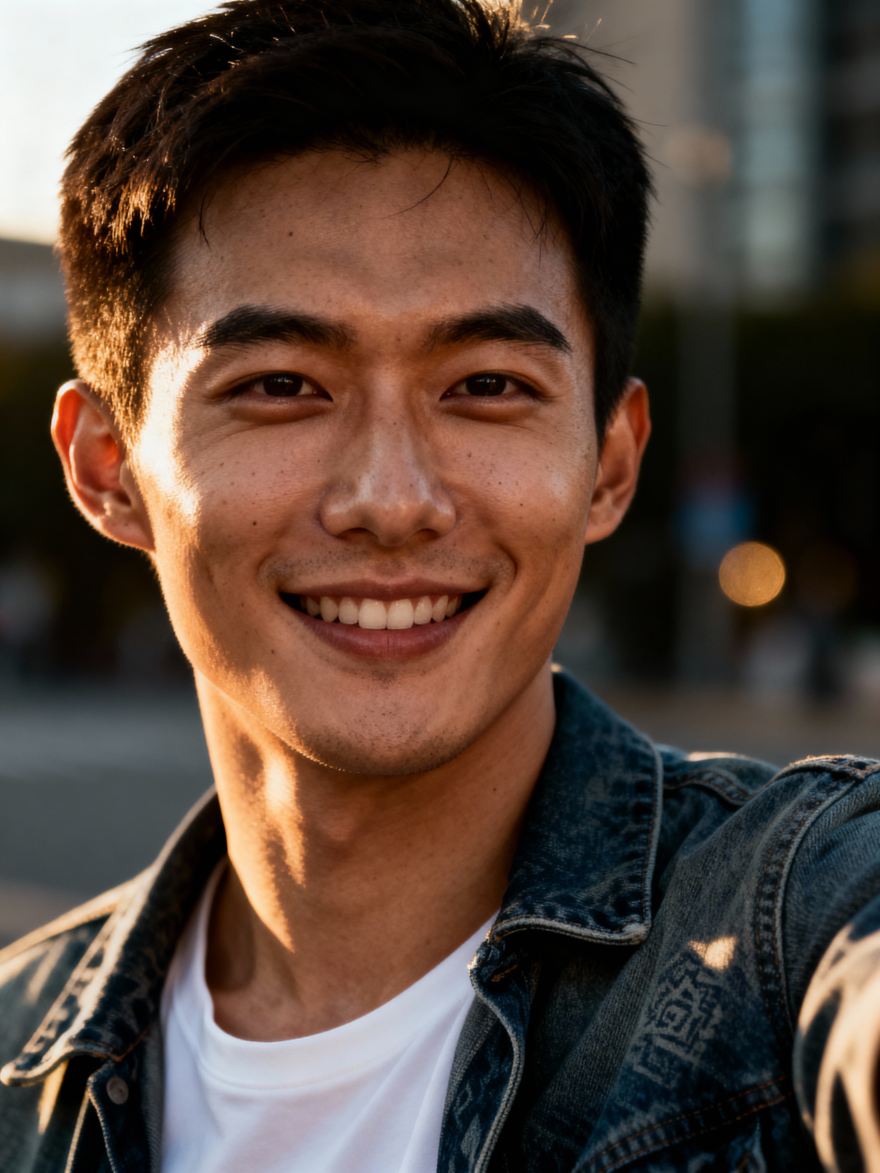 sincere masculine model snapping a selfie on a casual day out, with a genuine smile