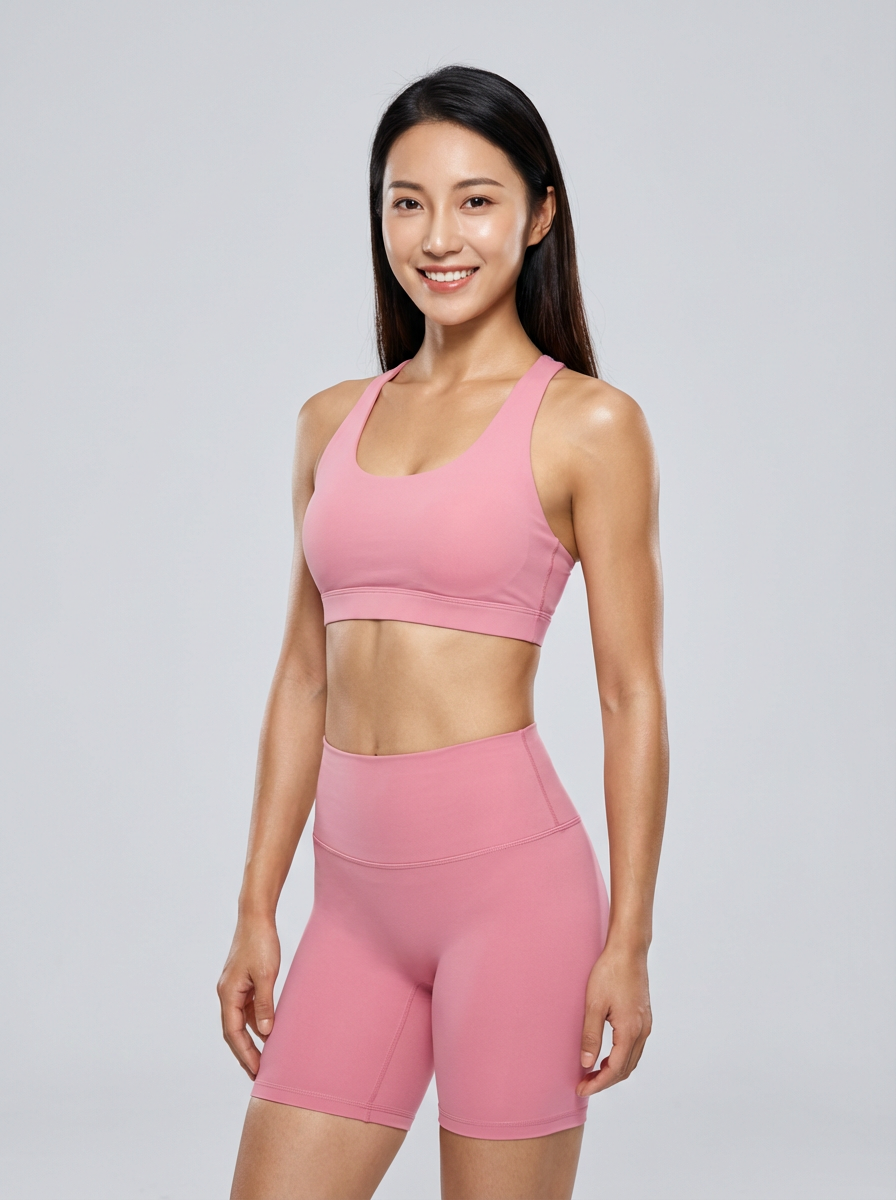 smiling beautiful female fitness model, athletic and fit but feminine, toned physique with healthy curves, flat stomach, light muscle definition (not bulky), glowing skin, long hair styled, plain background, wearing pink sports bra and pink leggings shorts