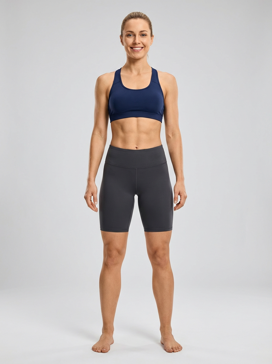 smiling female fitness model as with lean, toned, strong and defined physique, athletic curves, ripped abs, powerful legs, plain background . wearing sports bra and leggings shorts