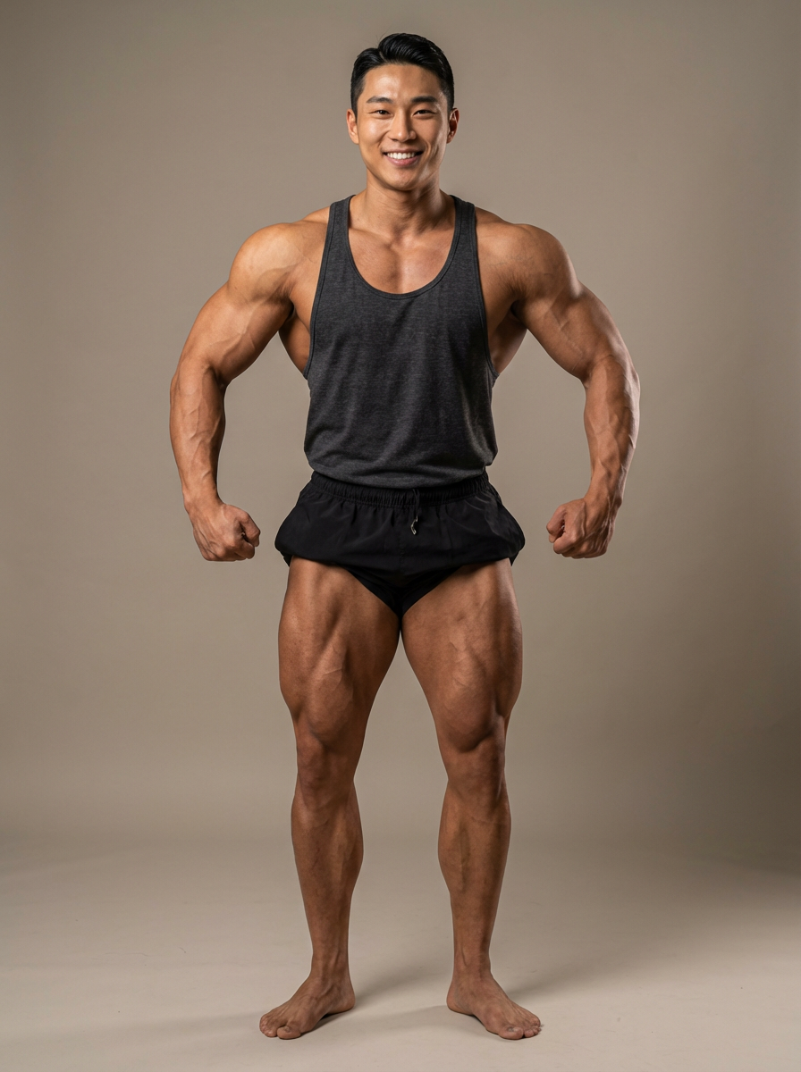 smiling male model, extremely muscular bodybuilder, gigantic ripped muscles, powerful fitness body, plain background, wearing tank top and gym short