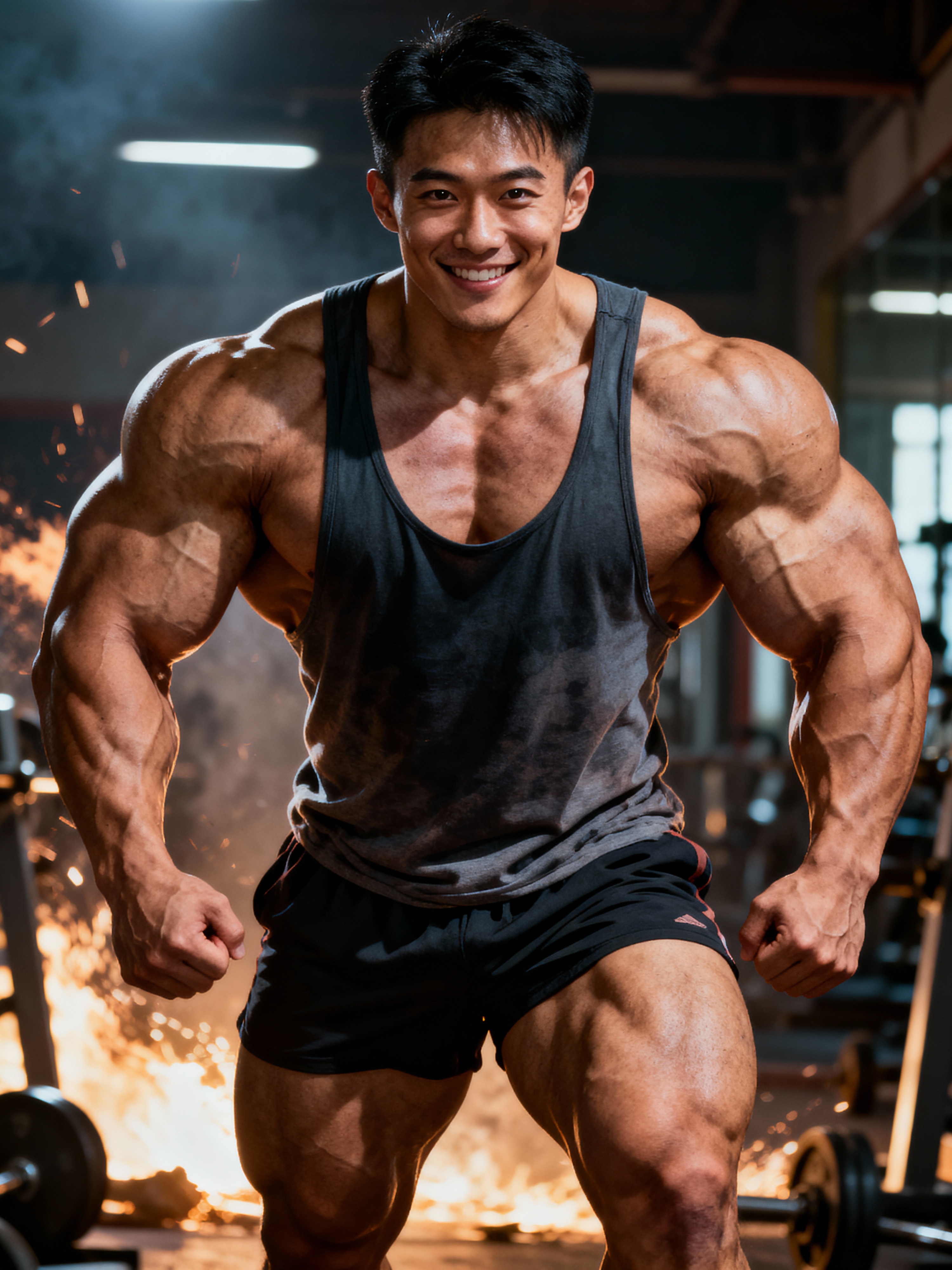 smiling model as extremely muscular bodybuilder gigantic giant muscles super big ripped fitness body. wearing tank top and gym shorts