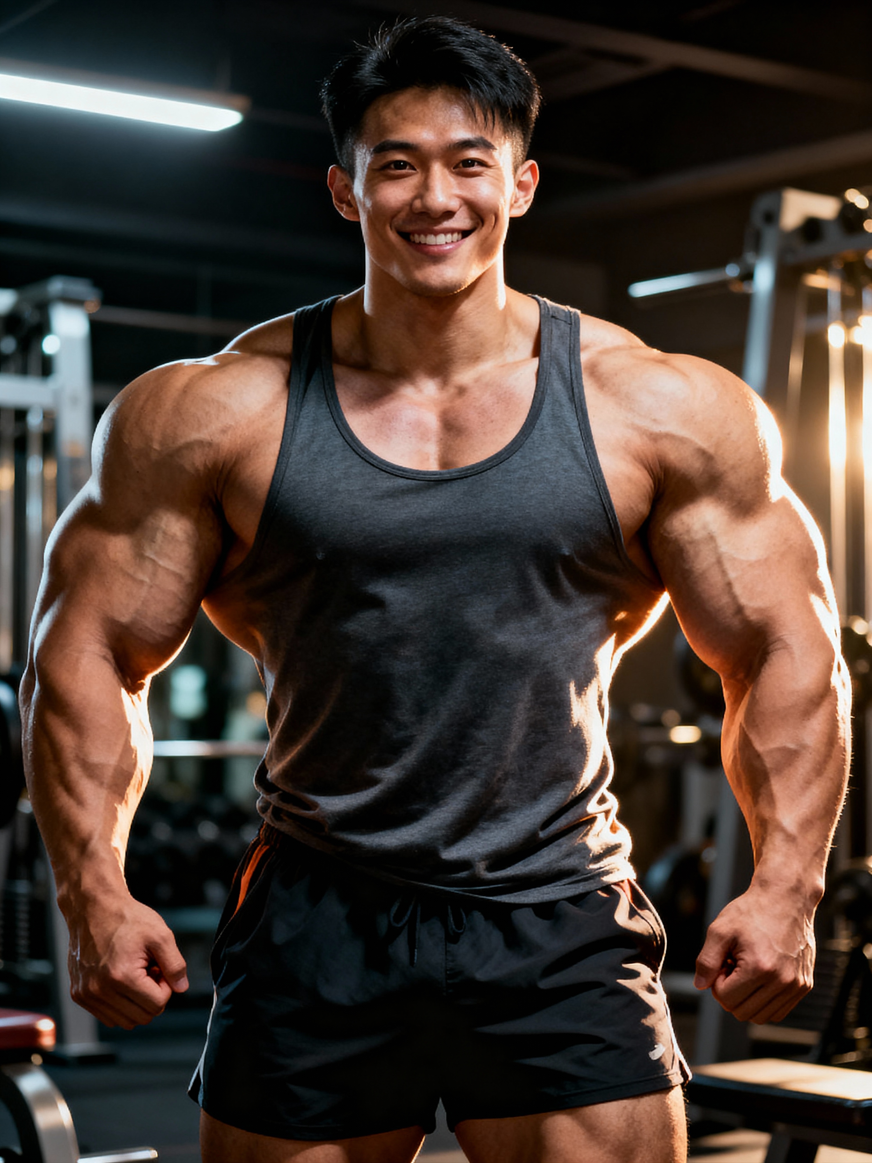 smiling model as extremely muscular bodybuilder gigantic giant muscles super big ripped fitness body. wearing tank top and gym shorts
