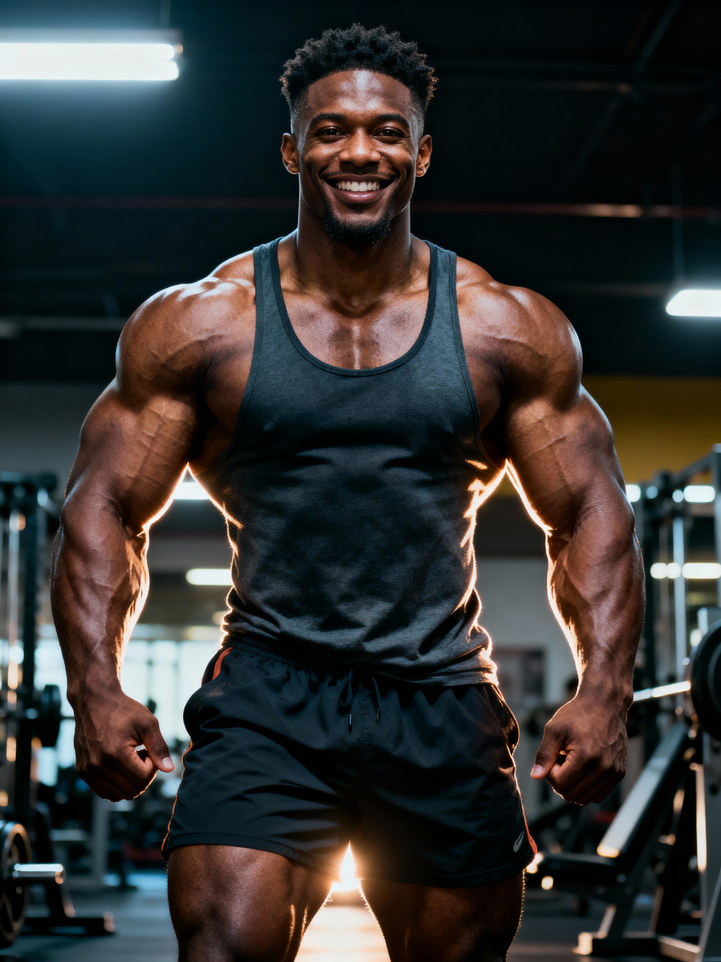 smiling model as extremely muscular bodybuilder gigantic giant muscles super big ripped fitness body. wearing tank top and gym shorts