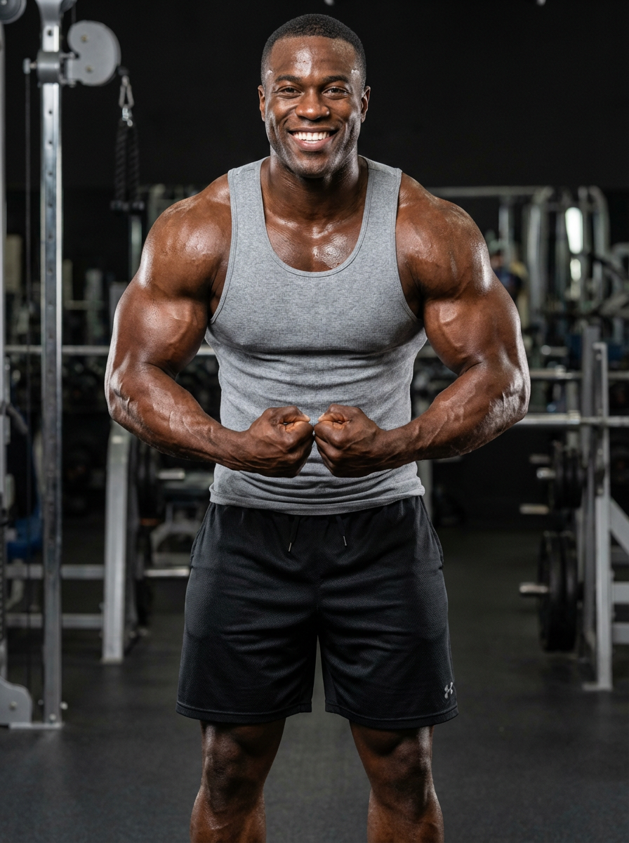 smiling model as extremely muscular bodybuilder gigantic giant muscles super big ripped fitness body. wearing tank top and gym shorts