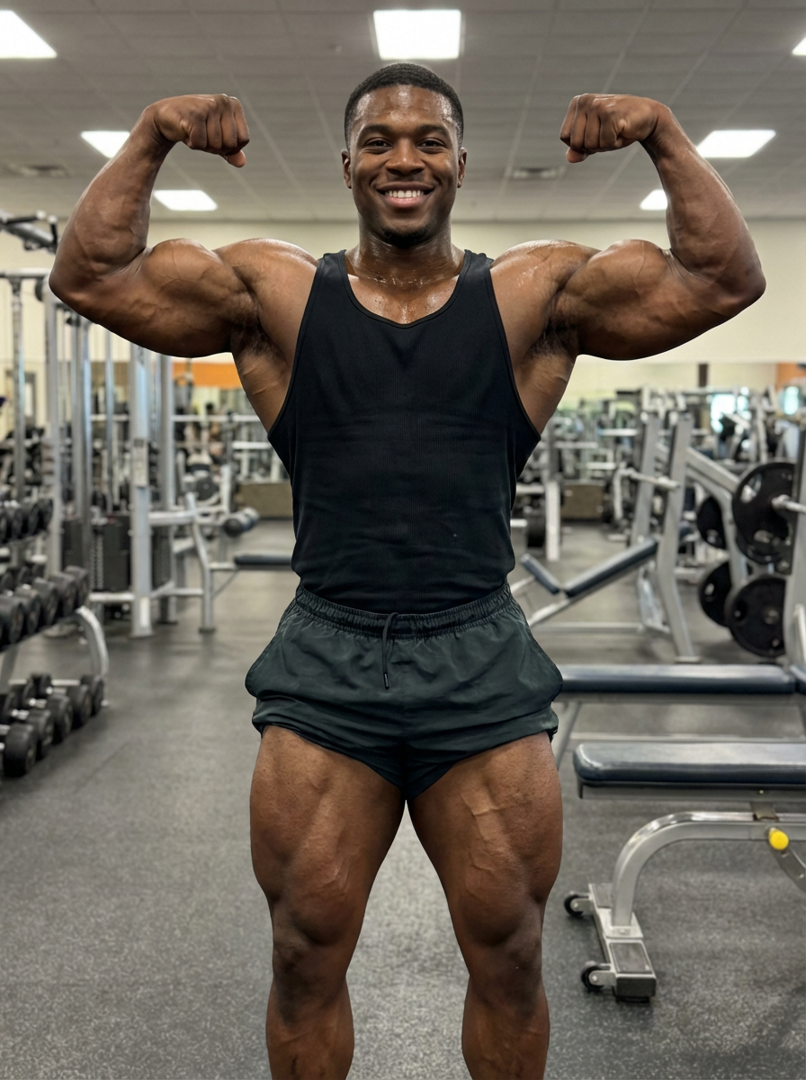 smiling model as extremely muscular bodybuilder gigantic giant muscles super big ripped fitness body. wearing tank top and gym shorts