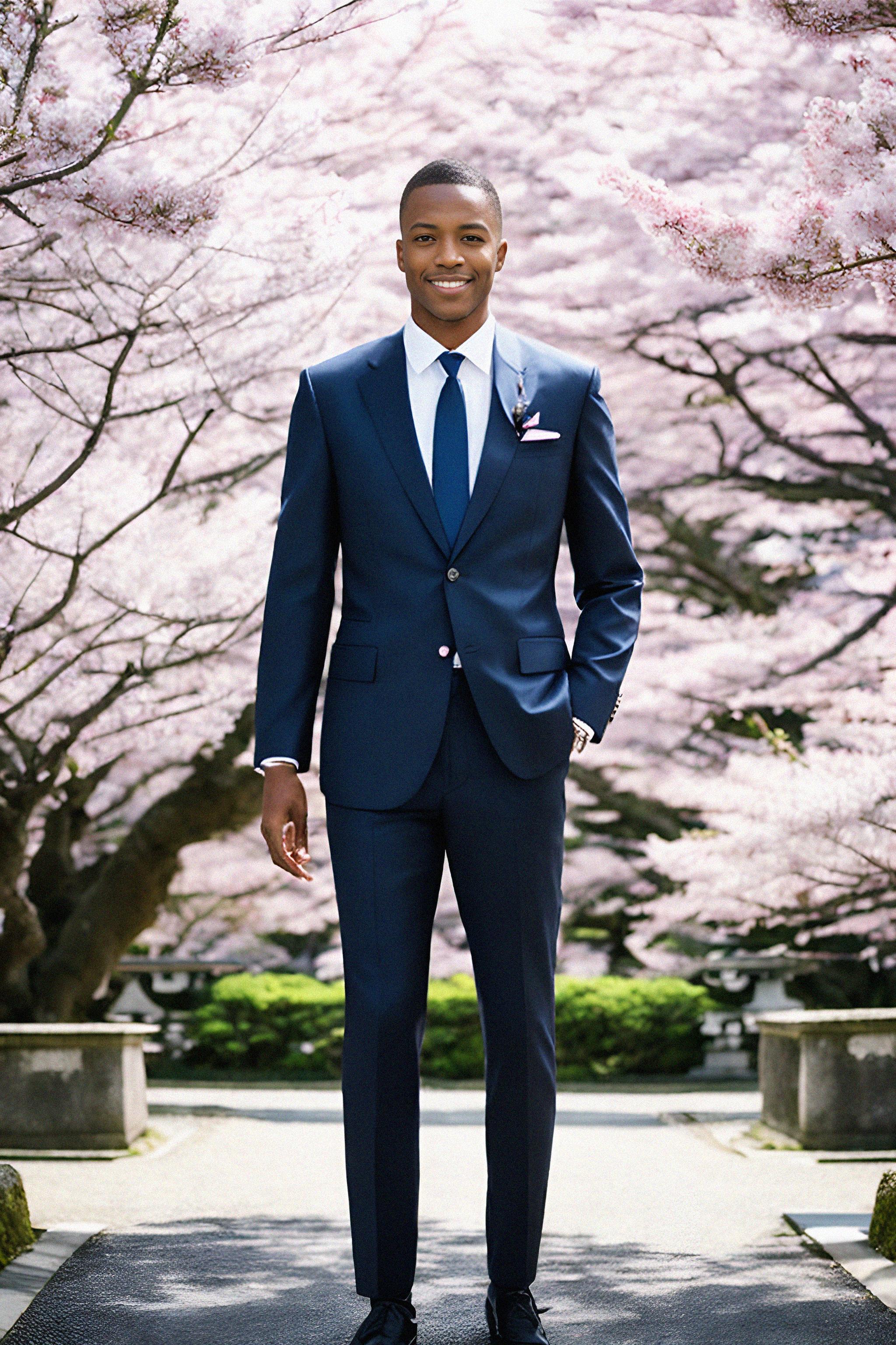smiling model in Japan with Japanese Cherry Blossom Trees and Japanese temples in background