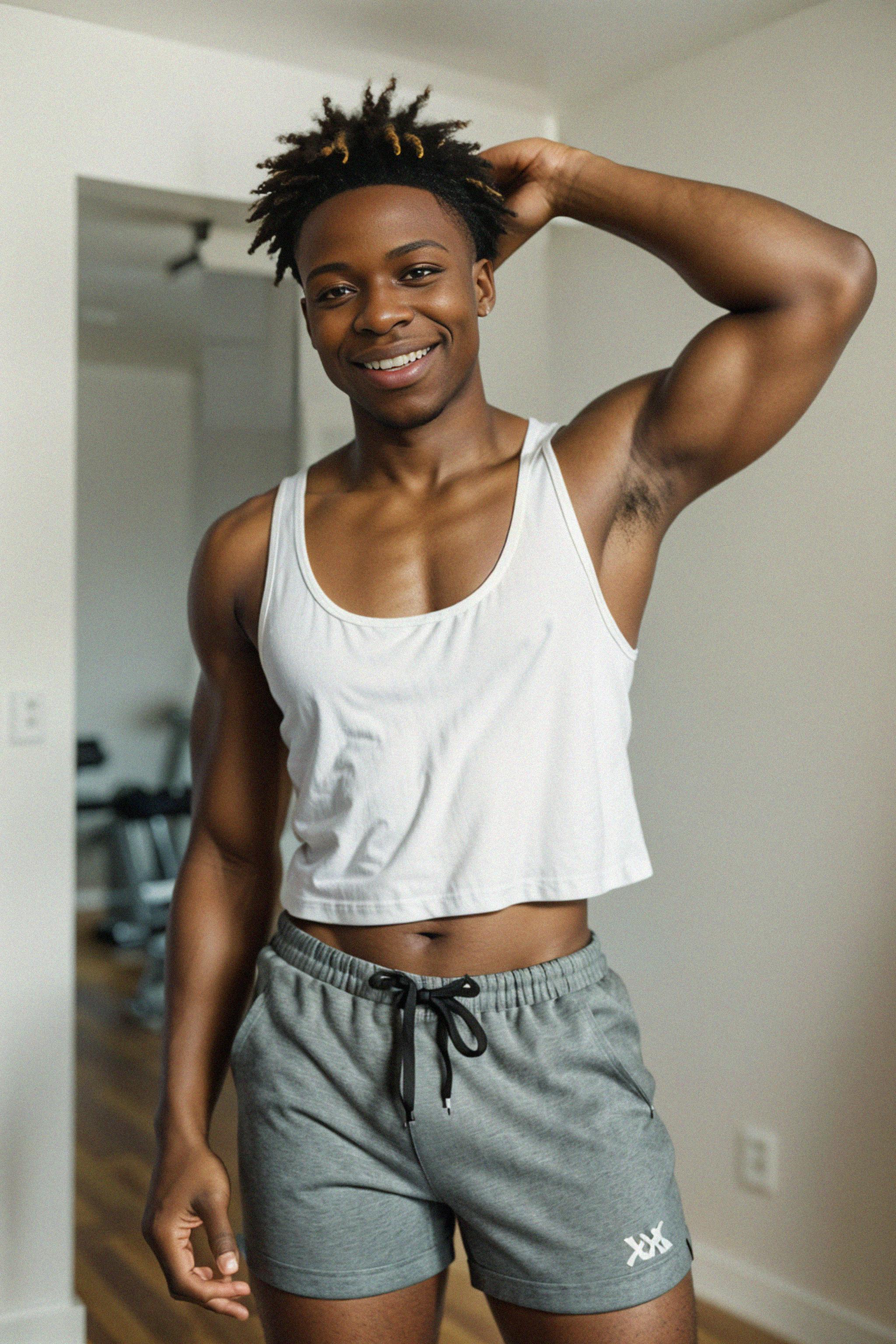 smiling model wearing tank top and gym shorts in try on fashion shoot for Zara Shein H&M