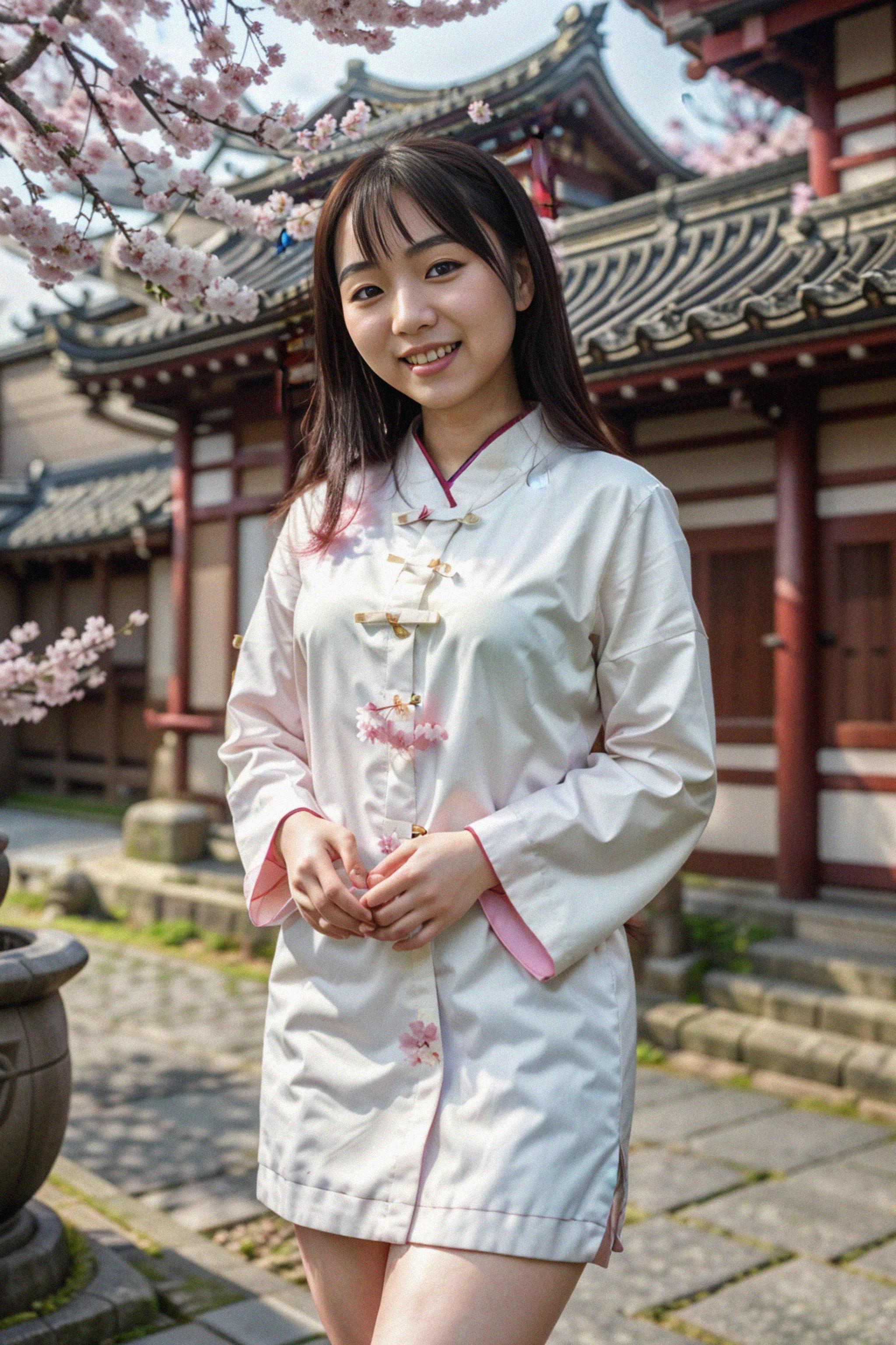smiling model in Japan with Japanese Cherry Blossom Trees and Japanese temples in background