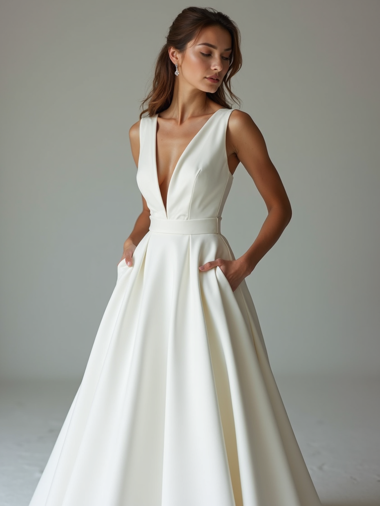 Sophisticated wedding photography, poised with elegance. Model wearing a minimalistic modern bridal gown . Clean and aesthetic composition.