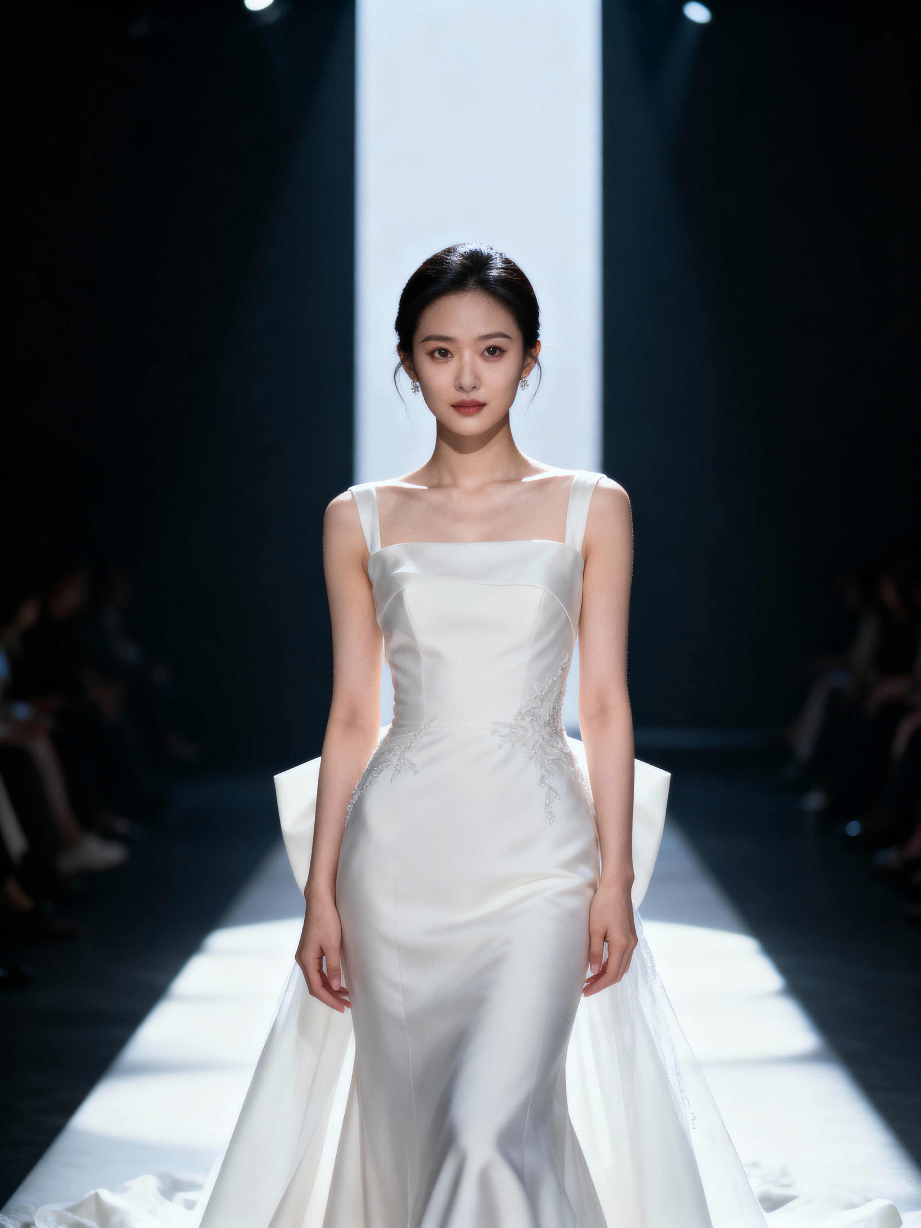 Sophisticated wedding photography, poised with elegance. Model wearing a minimalistic modern bridal gown . Clean and aesthetic composition.