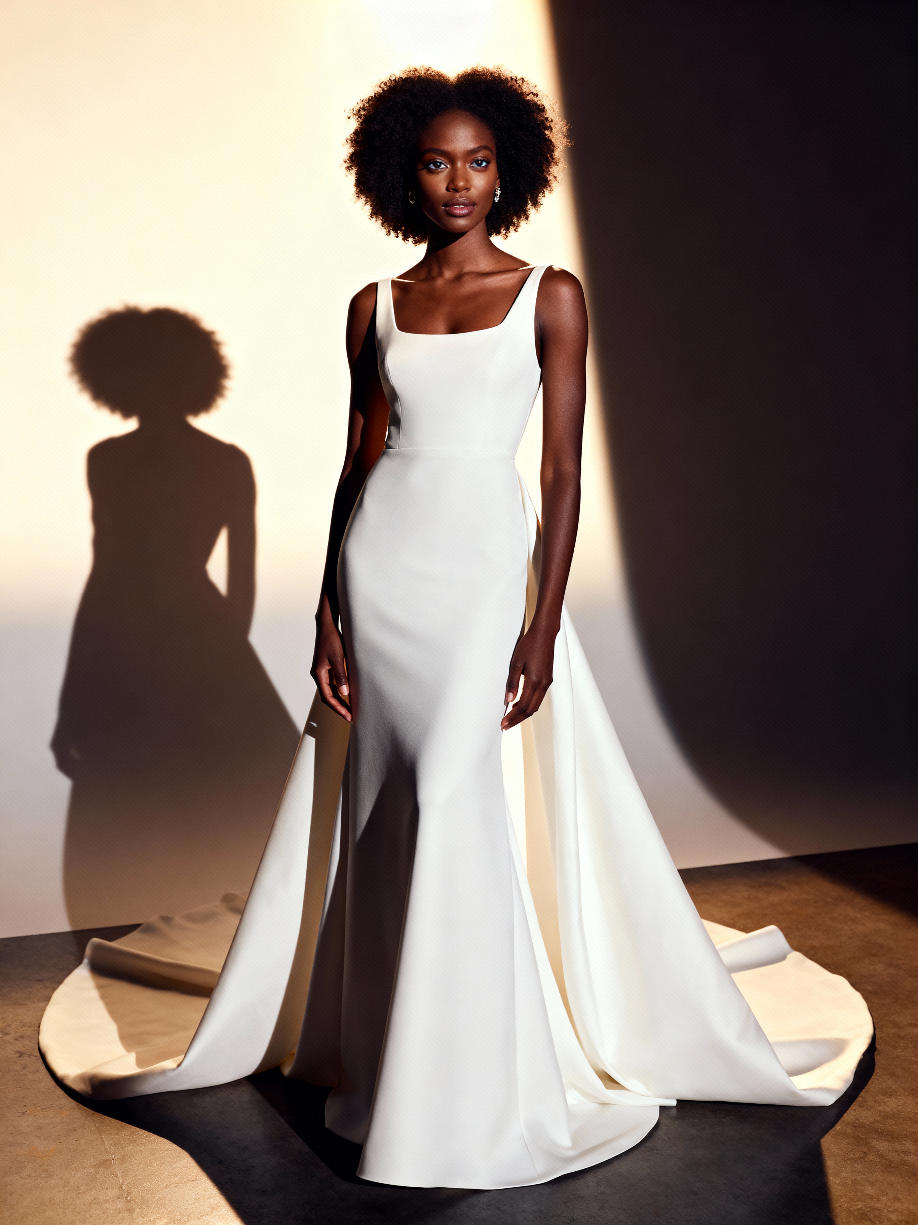 Sophisticated wedding photography, poised with elegance. Model wearing a minimalistic modern bridal gown . Clean and aesthetic composition.