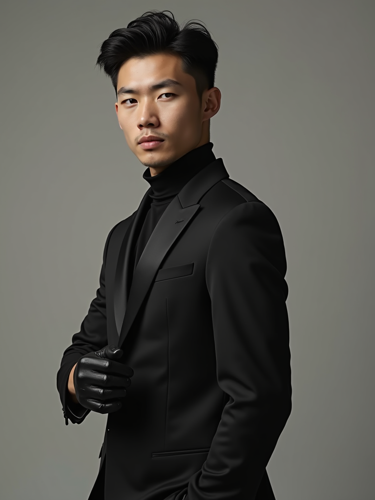 Sophisticated wedding photography, poised with elegance. Model wearing a sleek contemporary black suit . Clean and aesthetic composition.