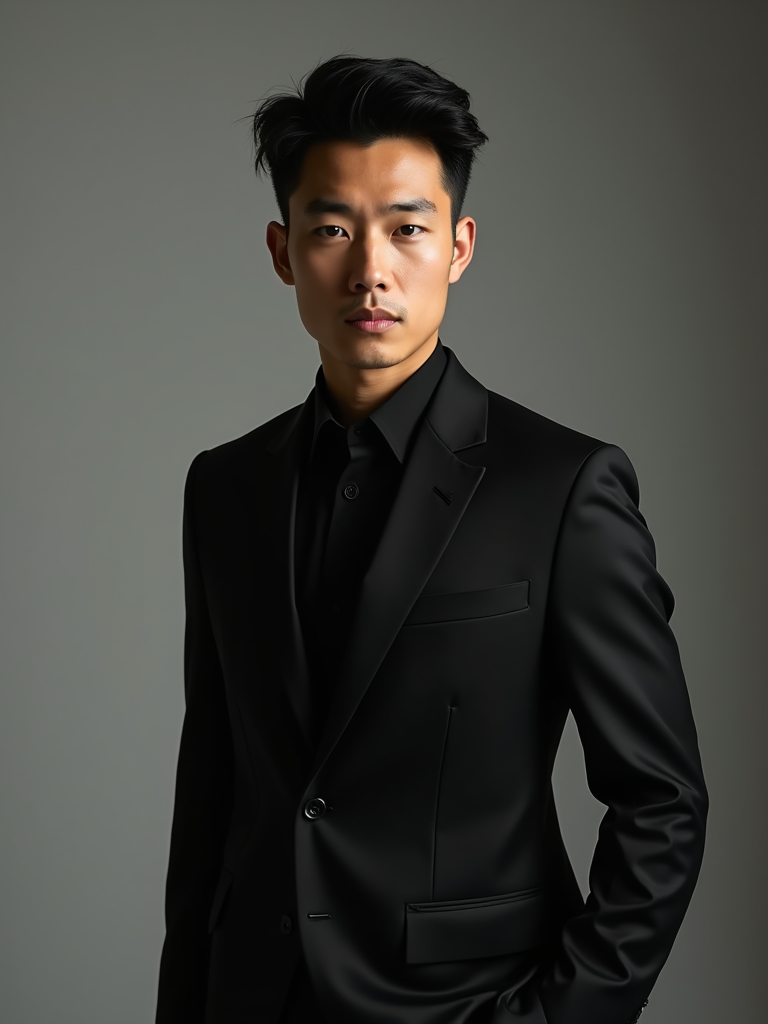 Sophisticated wedding photography, poised with elegance. Model wearing a sleek contemporary black suit . Clean and aesthetic composition.