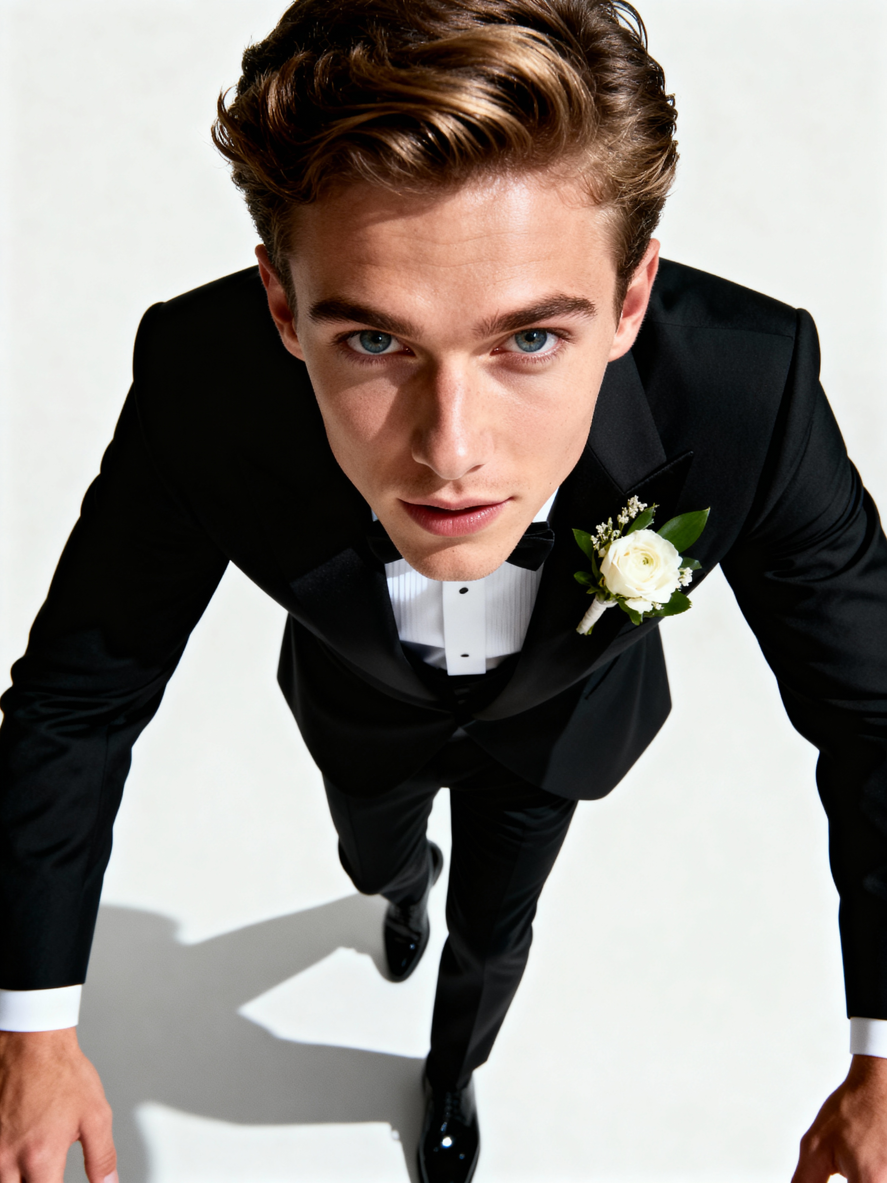 Sophisticated wedding photography, poised with elegance. Model wearing a sleek contemporary black suit with boutonnière . Clean and aesthetic composition.