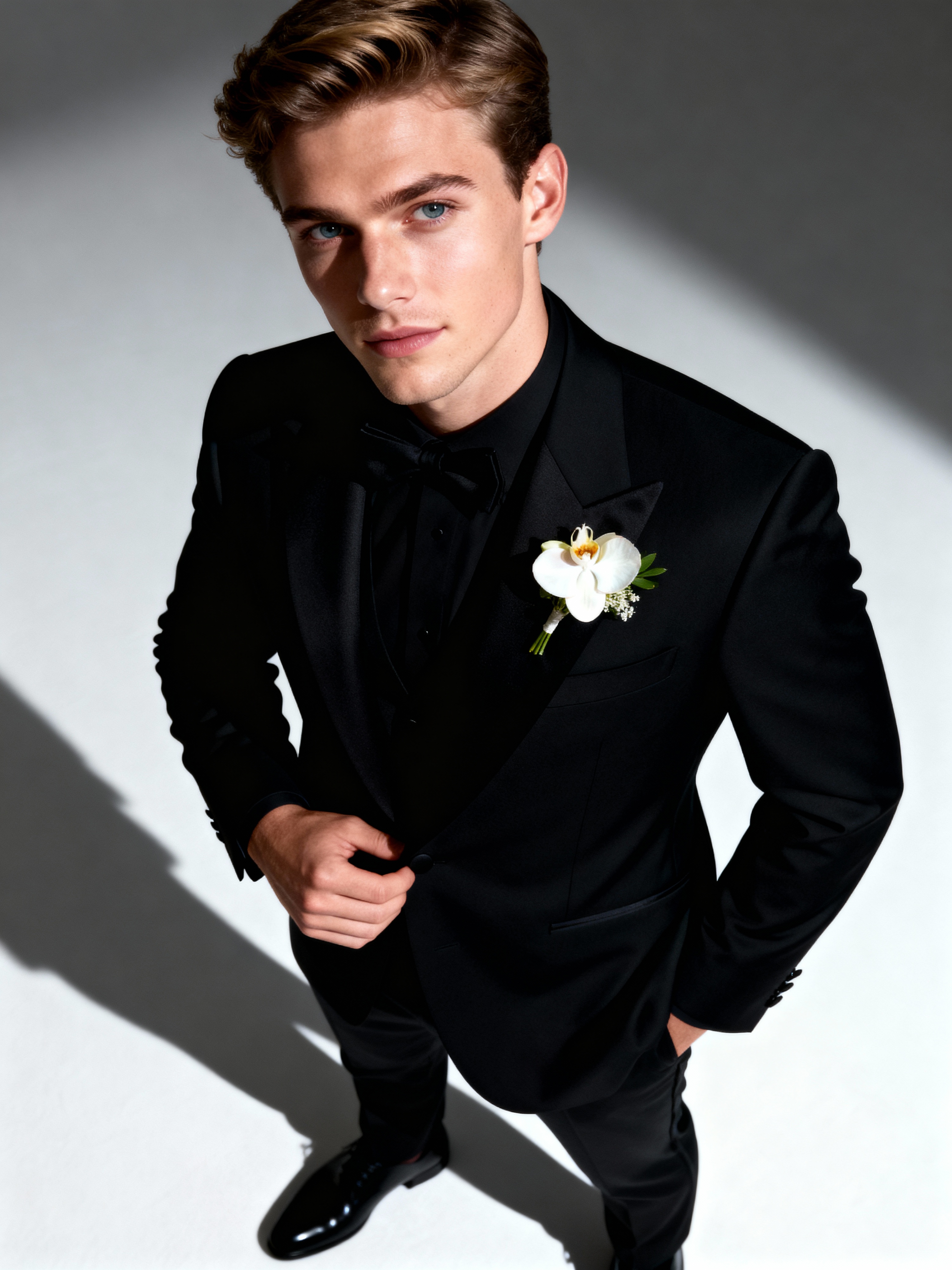 Sophisticated wedding photography, poised with elegance. Model wearing a sleek contemporary black suit with boutonnière . Clean and aesthetic composition.