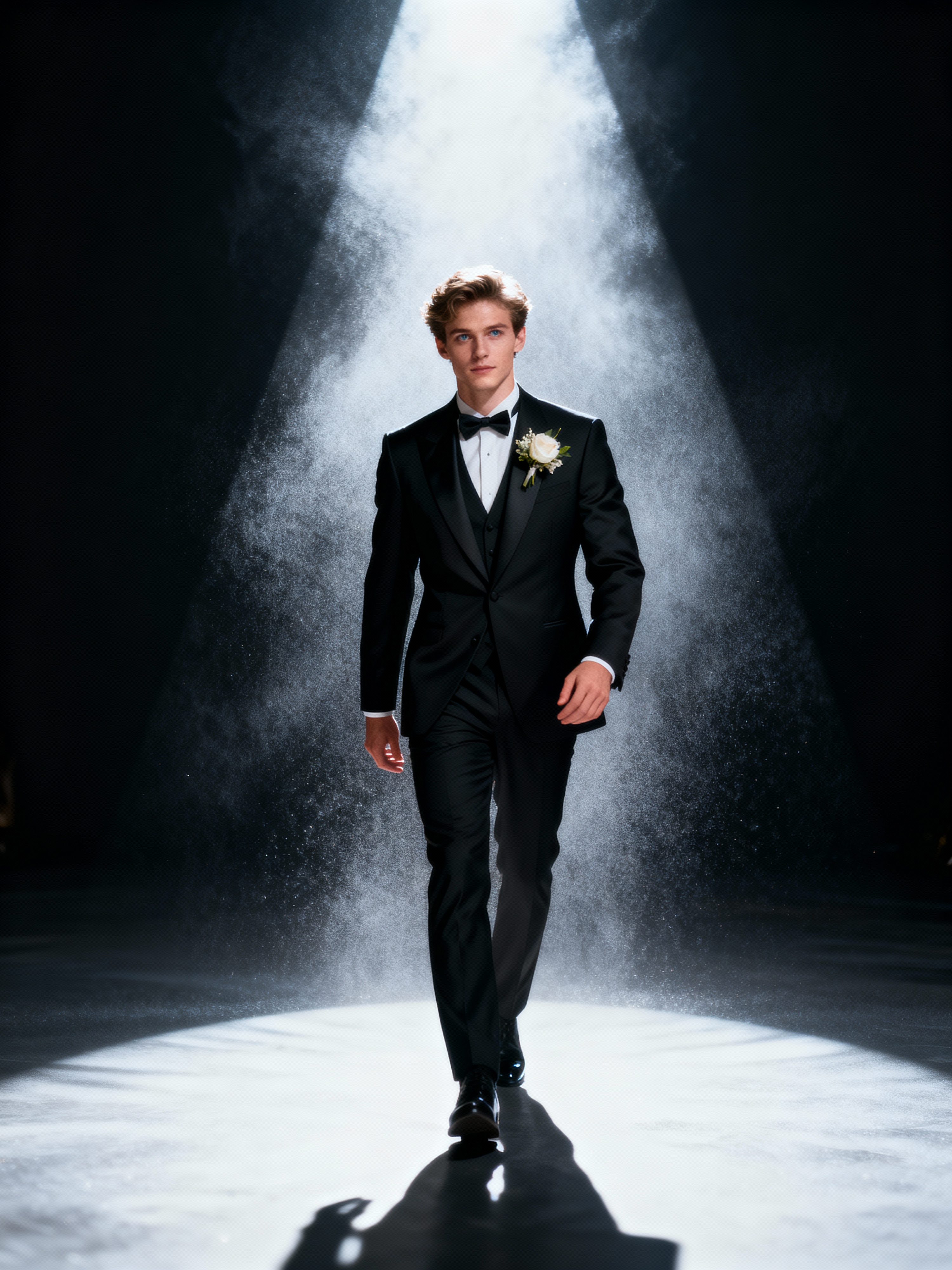 Sophisticated wedding photography, poised with elegance. Model wearing a sleek contemporary black suit with boutonnière . Clean and aesthetic composition.