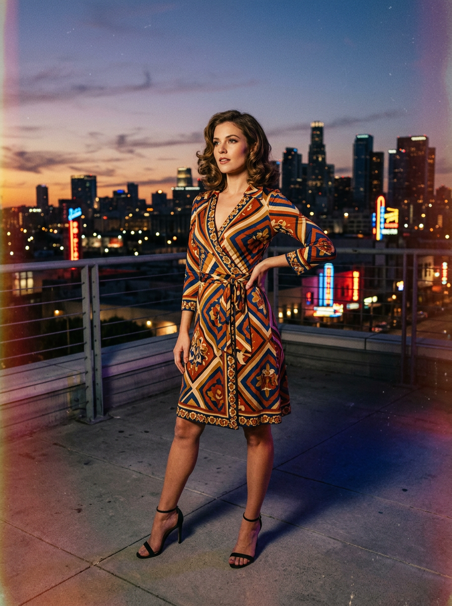 Sophisticated model in Diane von Furstenberg signature wrap dress in bold patterns, high heels striking confident pose against urban skyline at dusk, cinematic lighting with neon accents, vogue 1976 inspired, wide-angle lens, high-end fashion mood, sharp details, 320px