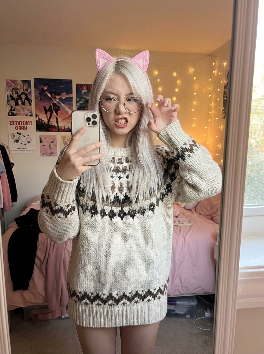 {"source_image_analysis": {"subject": {"demographics": "young model, tone", "hair": {"color": "Platinum blonde / Silver", "style": "Long, straight, draped over shoulders"}, "facial_features": {"eyewear": "Thin, round wire-rimmed glasses (silver or gold frame)", "expression": "Playful aggressive 'hissing' face, teeth bared, nose slightly scrunched", "makeup": "Natural look, soft pink lip "}}, "apparel": {"headwear": "Pink fuzzy cat ear headband", "clothing": {"type": "Chunky knit sweater / Jumper", "color": "Beige/Cream base", "pattern": "Nordic or Fair Isle style geometric zigzag stripes in navy blue, brown, and grey"}}, "pose_and_action": {"type": "Mirror selfie", "hands": {"left_hand": "Holding a smartphone (iPhone model with dual cameras)", "right_hand": "Raised in a playful 'claw' or 'scratch' gesture near face"}, "body_language": "Casual, energetic, playful"}, "environment": {"setting": "Bedroom / Dorm room", "background_elements": ["walls decorated with various posters and photos", "Warm LED fairy lights draped along the wall (creating soft bokeh)", "Bed with pink and floral bedding visible in background", "Doorway or mirror frame on the right"]}, "camera_and_technical": {"camera_woman": "Simulated Shot on iPhone 15 Pro Max or Fujifilm X100V", "lens_specs": "24mm wide-angle lens, f/1.8 aperture", "lighting_setup": {"type": "Mixed lighting", "key_light": "Soft diffuse daylight from window (simulated)", "ambient": "Warm tungsten glow from background fairy lights", "effect": "Soft highlights on hair, gentle shadows on face"}, "film_emulation": "Kodak Portra 400", "visual_fidelity": {"resolution": "8k, photorealistic", "details": "High texture fidelity on knit sweater and hair strands", "artifacts": "Slight film grain, subtle bloom on fairy lights, natural lens flare"}, "color_grading": "Soft pastel palette, low contrast, desaturated shadows, warm cozy tones", "composition": "Eye-level shot, rule of thirds, mirror reflection perspective"}}}