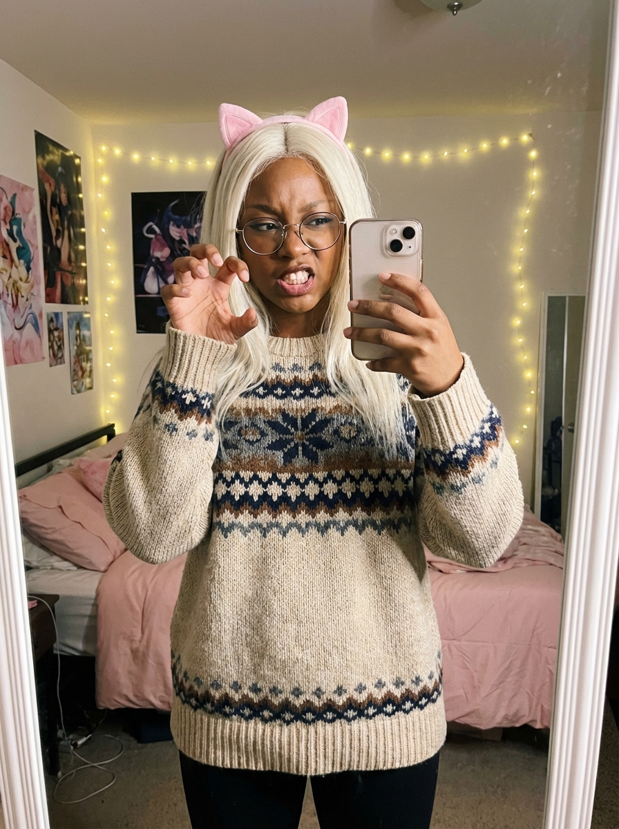 {"source_image_analysis": {"subject": {"demographics": "young model, tone", "hair": {"color": "Platinum blonde / Silver", "style": "Long, straight, draped over shoulders"}, "facial_features": {"eyewear": "Thin, round wire-rimmed glasses (silver or gold frame)", "expression": "Playful aggressive 'hissing' face, teeth bared, nose slightly scrunched", "makeup": "Natural look, soft pink lip "}}, "apparel": {"headwear": "Pink fuzzy cat ear headband", "clothing": {"type": "Chunky knit sweater / Jumper", "color": "Beige/Cream base", "pattern": "Nordic or Fair Isle style geometric zigzag stripes in navy blue, brown, and grey"}}, "pose_and_action": {"type": "Mirror selfie", "hands": {"left_hand": "Holding a smartphone (iPhone model with dual cameras)", "right_hand": "Raised in a playful 'claw' or 'scratch' gesture near face"}, "body_language": "Casual, energetic, playful"}, "environment": {"setting": "Bedroom / Dorm room", "background_elements": ["walls decorated with various posters and photos", "Warm LED fairy lights draped along the wall (creating soft bokeh)", "Bed with pink and floral bedding visible in background", "Doorway or mirror frame on the right"]}, "camera_and_technical": {"camera_woman": "Simulated Shot on iPhone 15 Pro Max or Fujifilm X100V", "lens_specs": "24mm wide-angle lens, f/1.8 aperture", "lighting_setup": {"type": "Mixed lighting", "key_light": "Soft diffuse daylight from window (simulated)", "ambient": "Warm tungsten glow from background fairy lights", "effect": "Soft highlights on hair, gentle shadows on face"}, "film_emulation": "Kodak Portra 400", "visual_fidelity": {"resolution": "8k, photorealistic", "details": "High texture fidelity on knit sweater and hair strands", "artifacts": "Slight film grain, subtle bloom on fairy lights, natural lens flare"}, "color_grading": "Soft pastel palette, low contrast, desaturated shadows, warm cozy tones", "composition": "Eye-level shot, rule of thirds, mirror reflection perspective"}}}