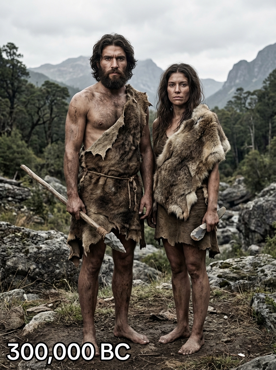 Stone Age couple from 300,000 BC in earliest human clothing - basic fur coverings, stone tools, rugged appearance, standing together in a primordial landscape with mountains and ancient forests, text overlay in bottom corner reading "300,000 BC" in white sans serif font with black outline