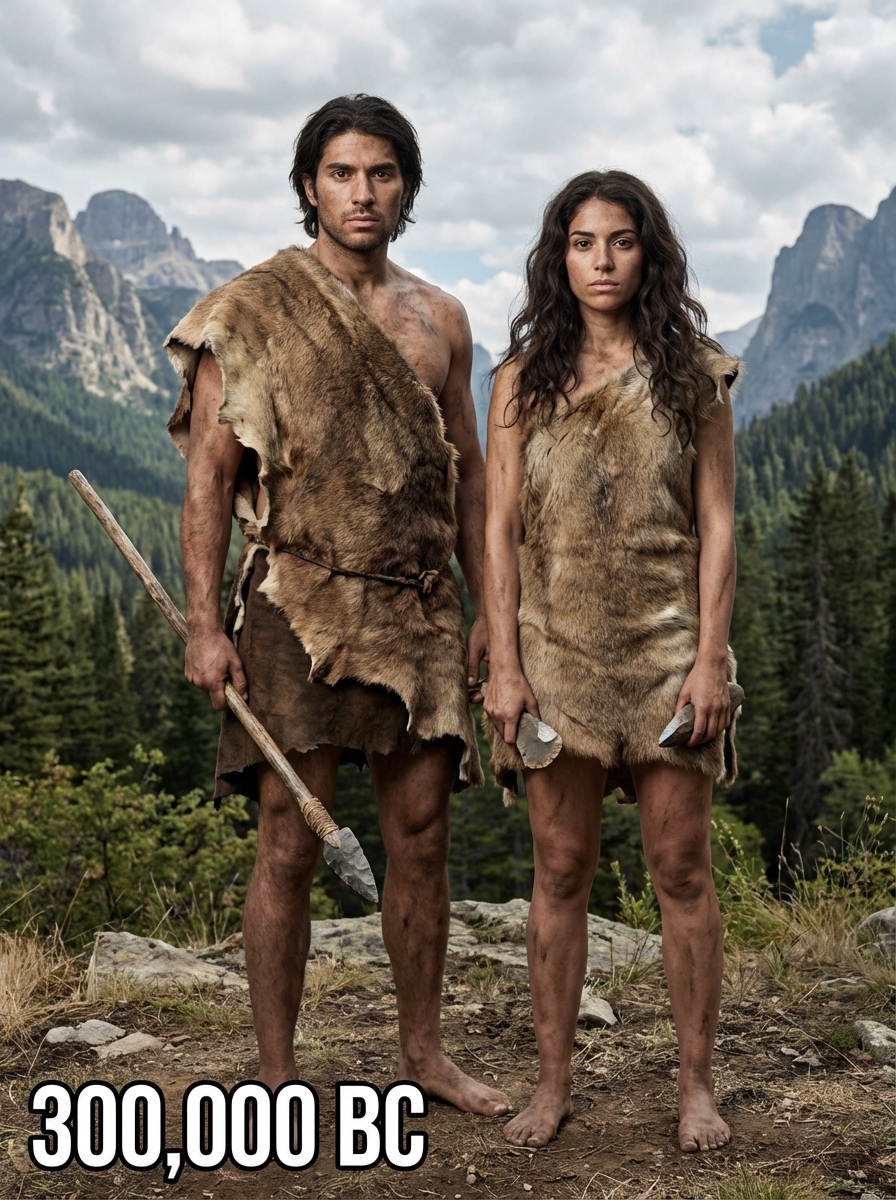 Related photosStone Age couple from 300,000 BC in earliest human clothing -  basic fur coverings, stone tools, rugged appearance, standing together in a primordial landscape with mountains and ancient forests, text overlay in bottom corner reading "300,000 BC" in white sans serif font with black outlineStone Age couple from 300,000 BC in earliest human clothing -  basic fur coverings, stone tools, rugged appearance, standing together in a primordial landscape with mountains and ancient forests, text overlay in bottom corner reading "300,000 BC" in white sans serif font with black outlineStone Age couple from 300,000 BC in earliest human clothing -  basic fur coverings, stone tools, rugged appearance, standing together in a primordial landscape with mountains and ancient forests, text overlay in bottom corner reading "300,000 BC" in white sans serif font with black outlinehappy man in Lederhosen for Oktoberfest at Oktoberfestsharp and trendy man in Barcelona wearing a flamenco-inspired dress/suit, Park Güell in the backgroundsharp and trendy man in Dubai wearing a modern, chic abaya/thobe, skyscrapers of Dubai in the background