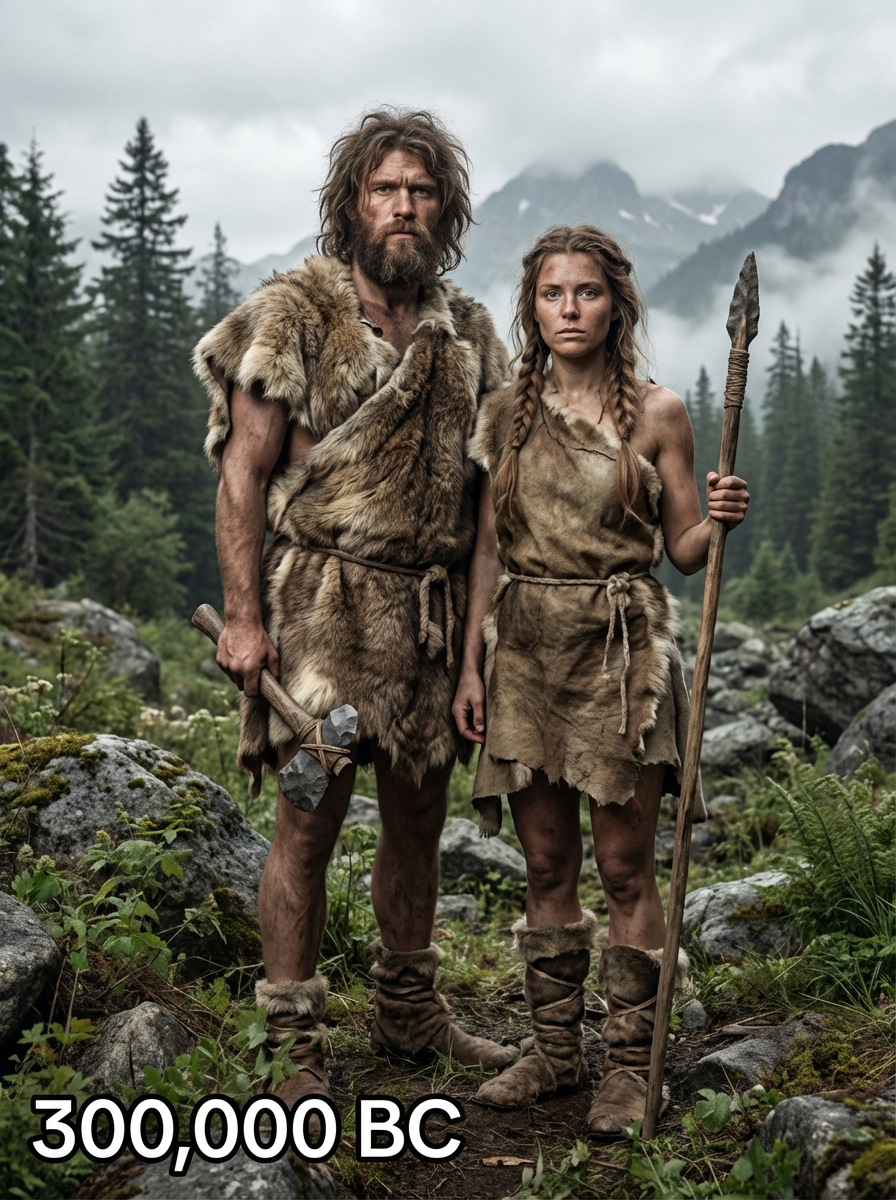 Stone Age couple from 300,000 BC in earliest human clothing - basic fur coverings, stone tools, rugged appearance, standing together in a primordial landscape with mountains and ancient forests, text overlay in bottom corner reading "300,000 BC" in white sans serif font with black outline