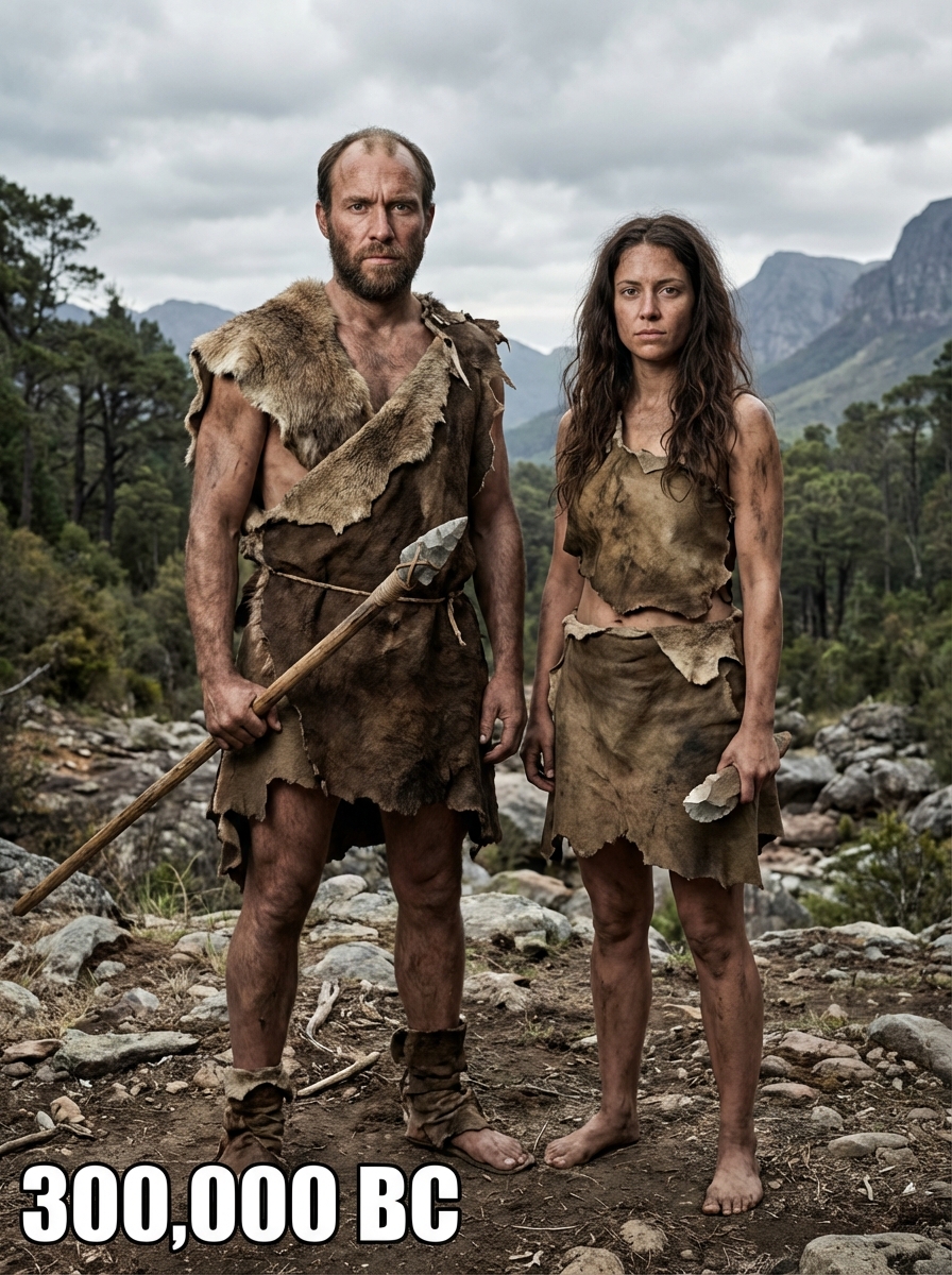 Stone Age couple from 300,000 BC in earliest human clothing - basic fur coverings, stone tools, rugged appearance, standing together in a primordial landscape with mountains and ancient forests, text overlay in bottom corner reading "300,000 BC" in white sans serif font with black outline