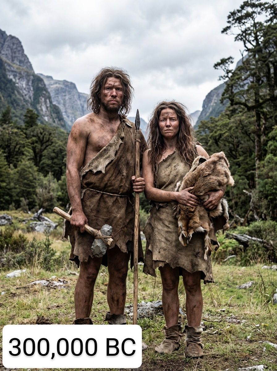 Stone Age couple from 300,000 BC in earliest human clothing - basic fur coverings, stone tools, rugged appearance, standing together in a primordial landscape with mountains and ancient forests, text overlay in bottom corner reading "300,000 BC" in white sans serif font with black outline