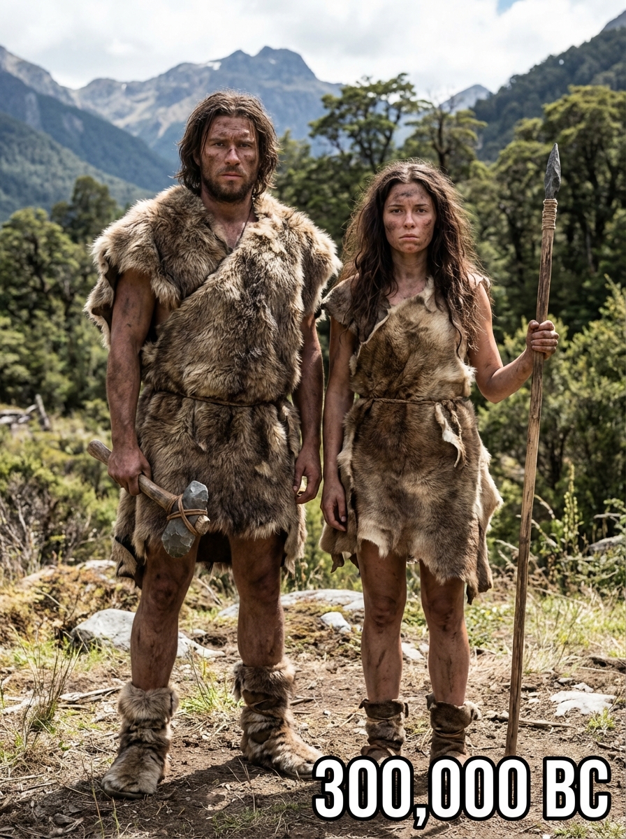 Stone Age couple from 300,000 BC in earliest human clothing - basic fur coverings, stone tools, rugged appearance, standing together in a primordial landscape with mountains and ancient forests, text overlay in bottom corner reading "300,000 BC" in white sans serif font with black outline