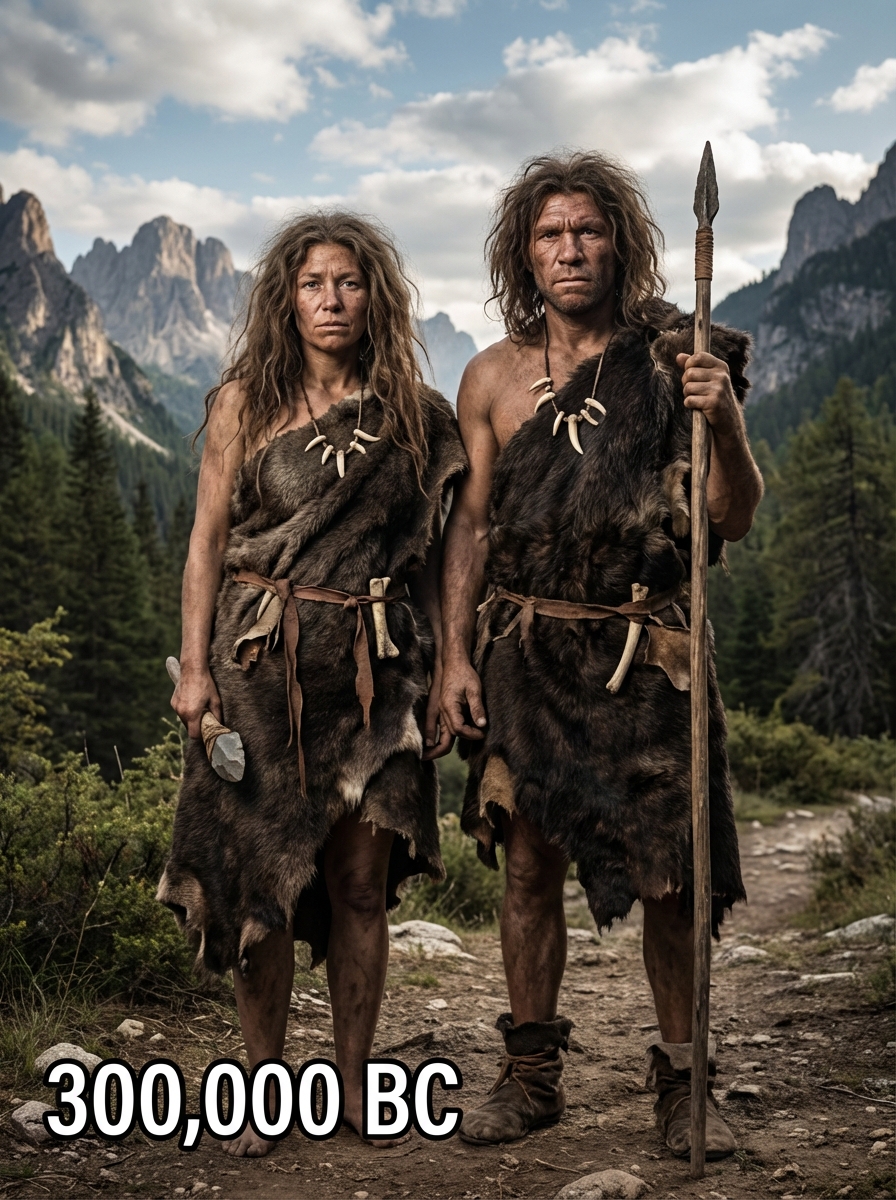 Stone Age couple from 300,000 BC in earliest human clothing - rough animal pelts, primitive bone ornaments, natural hair , standing together in a primordial landscape with mountains and ancient forests, text overlay in bottom corner reading "300,000 BC" in white sans serif font with black outline