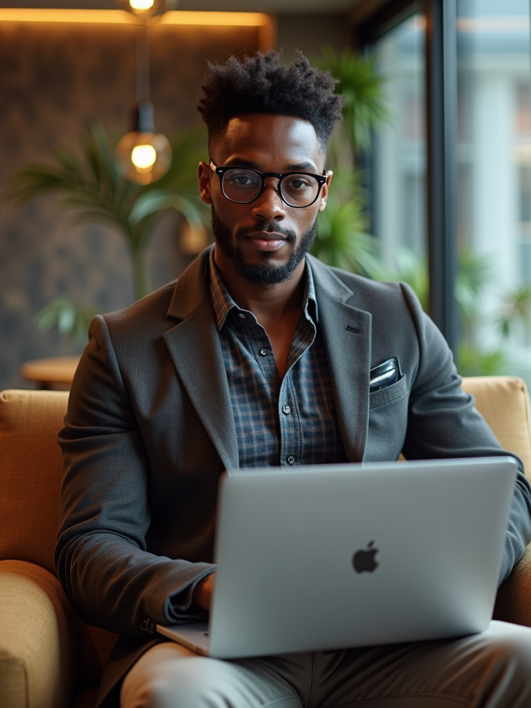 strategic model wearing smart casual outfit with designer details coworking space lounge area, engaged with laptop