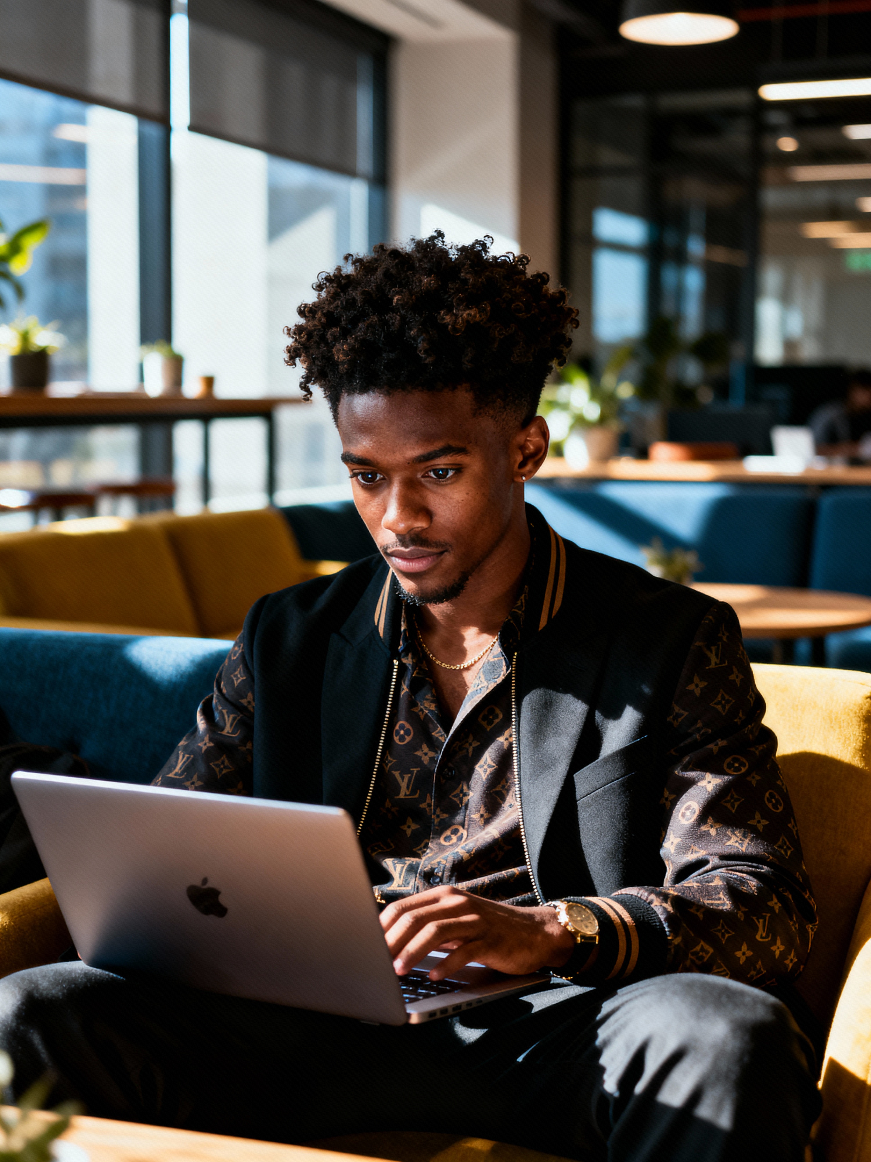 strategic model wearing smart casual outfit with designer details coworking space lounge area, engaged with laptop