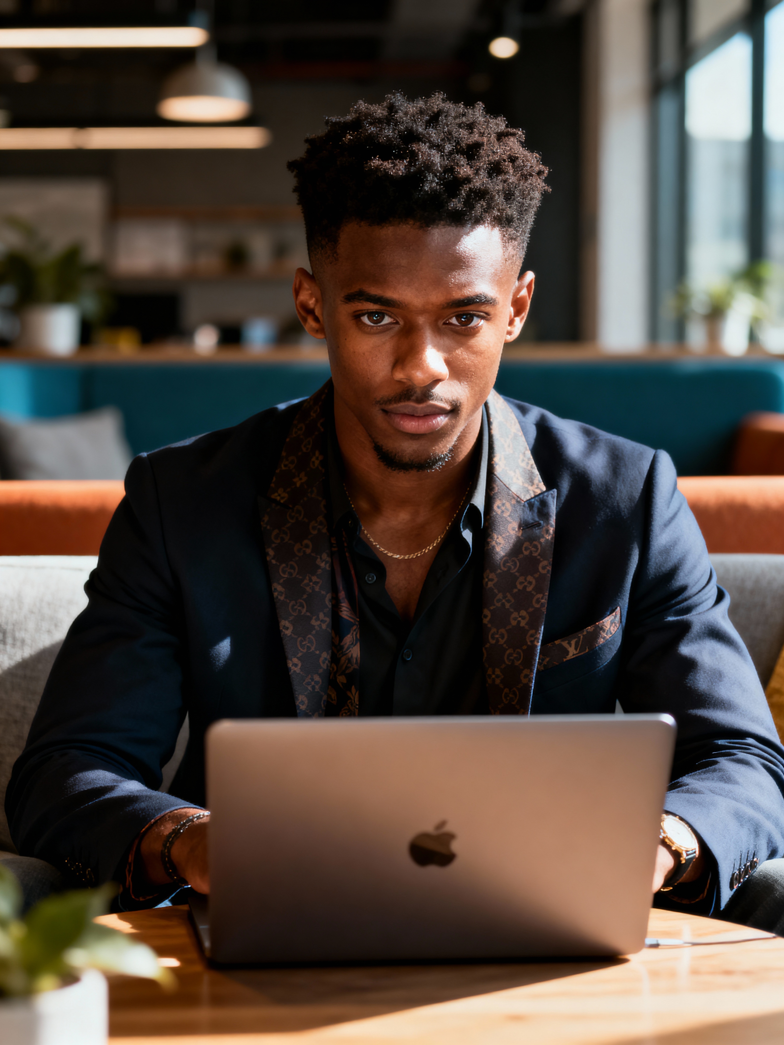 strategic model wearing smart casual outfit with designer details coworking space lounge area, engaged with laptop