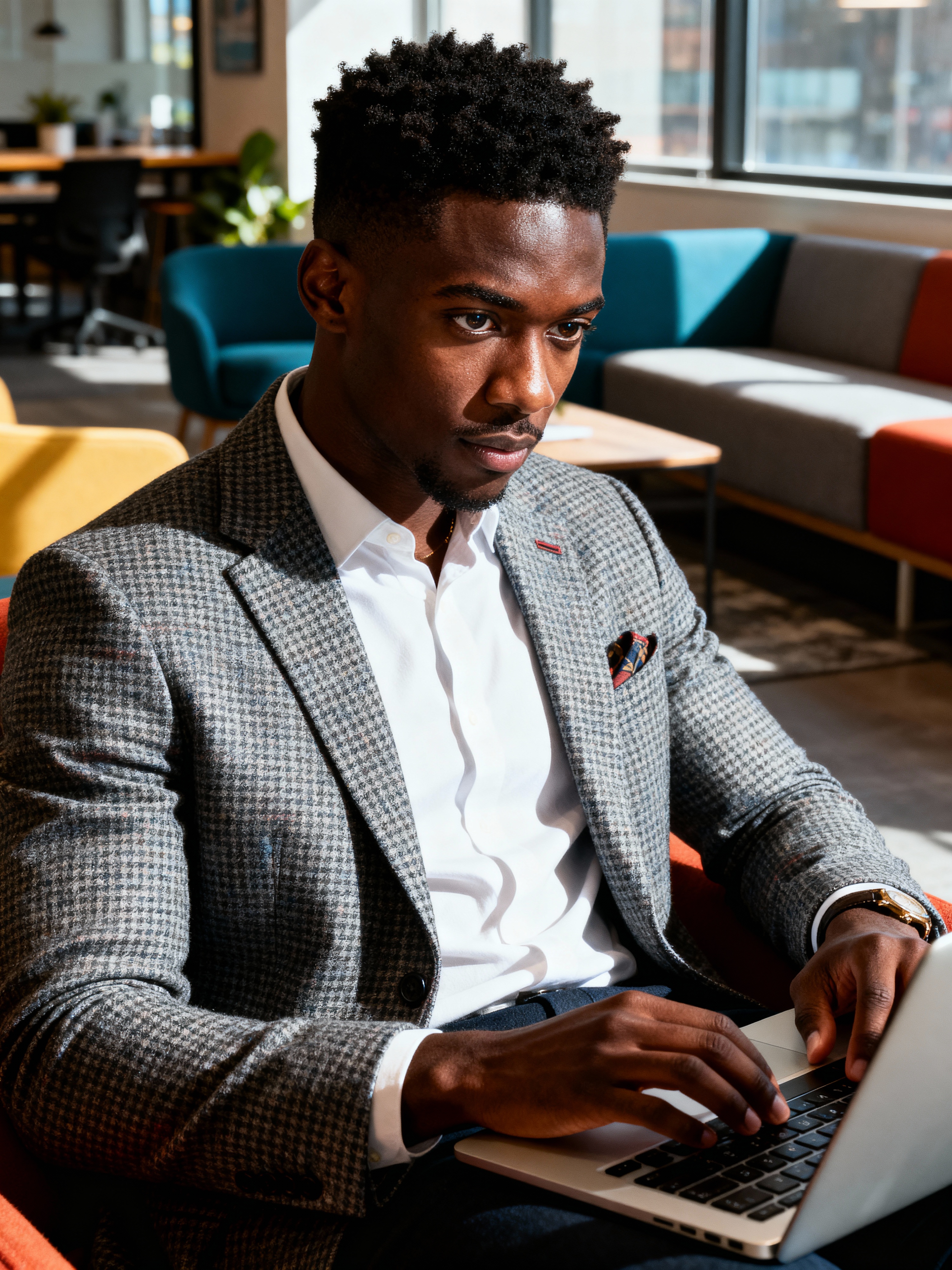 strategic model wearing smart casual outfit with designer details coworking space lounge area, engaged with laptop