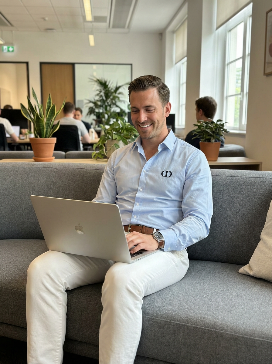 strategic model wearing smart casual outfit with designer details coworking space lounge area, engaged with laptop