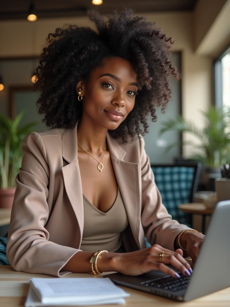strategic model wearing contemporary business casual ensemble with tasteful jewelry coworking space lounge area, engaged with laptop