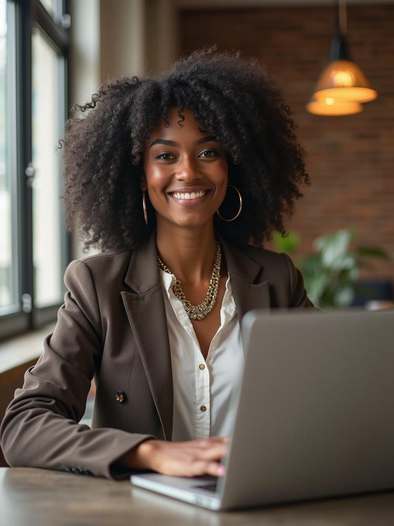 strategic model wearing contemporary business casual ensemble with tasteful jewelry coworking space lounge area, engaged with laptop