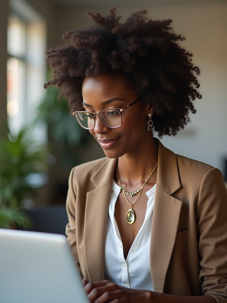 strategic model wearing contemporary business casual ensemble with tasteful jewelry coworking space lounge area, engaged with laptop