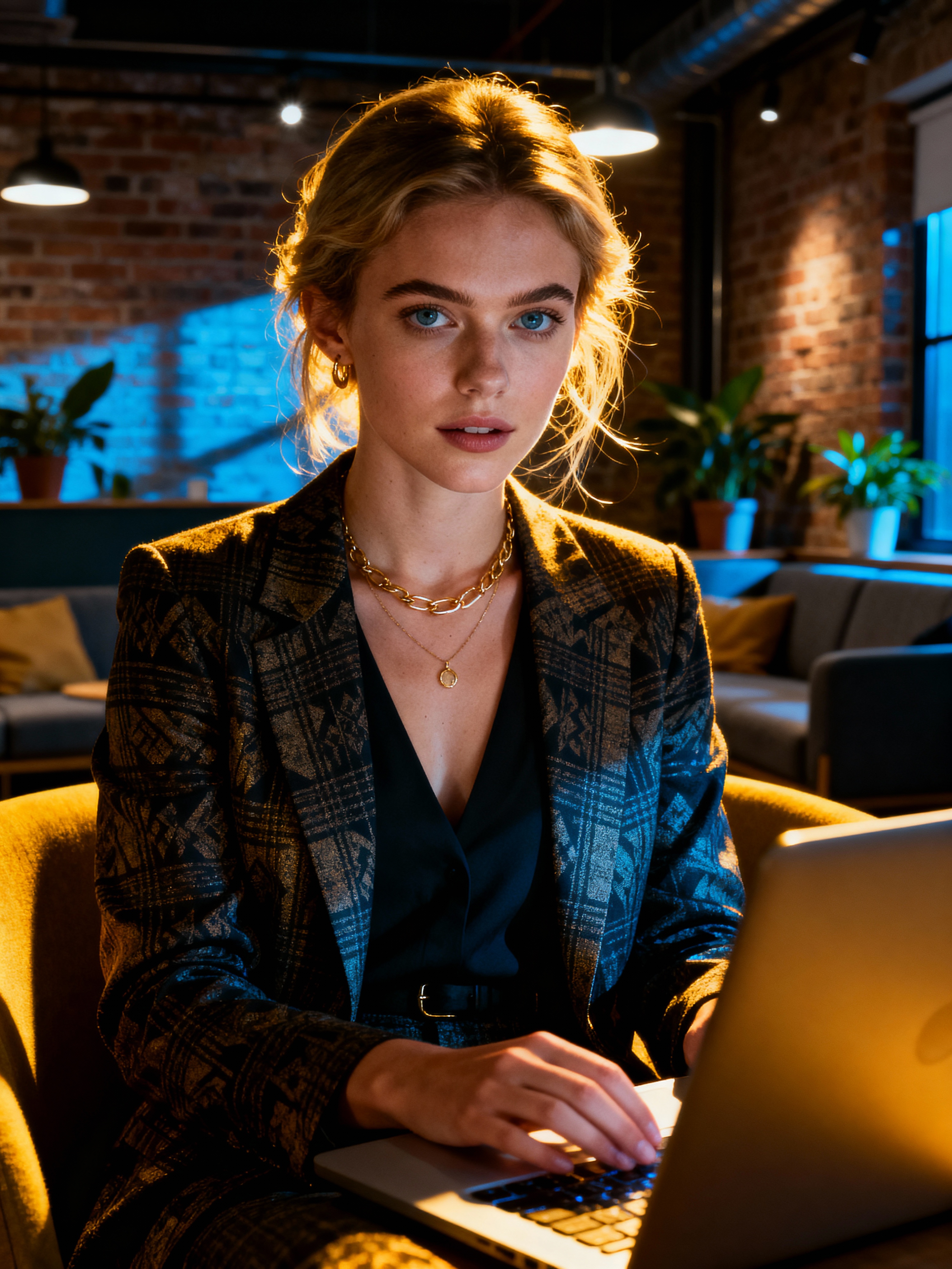 strategic model wearing contemporary business casual ensemble with tasteful jewelry coworking space lounge area, engaged with laptop