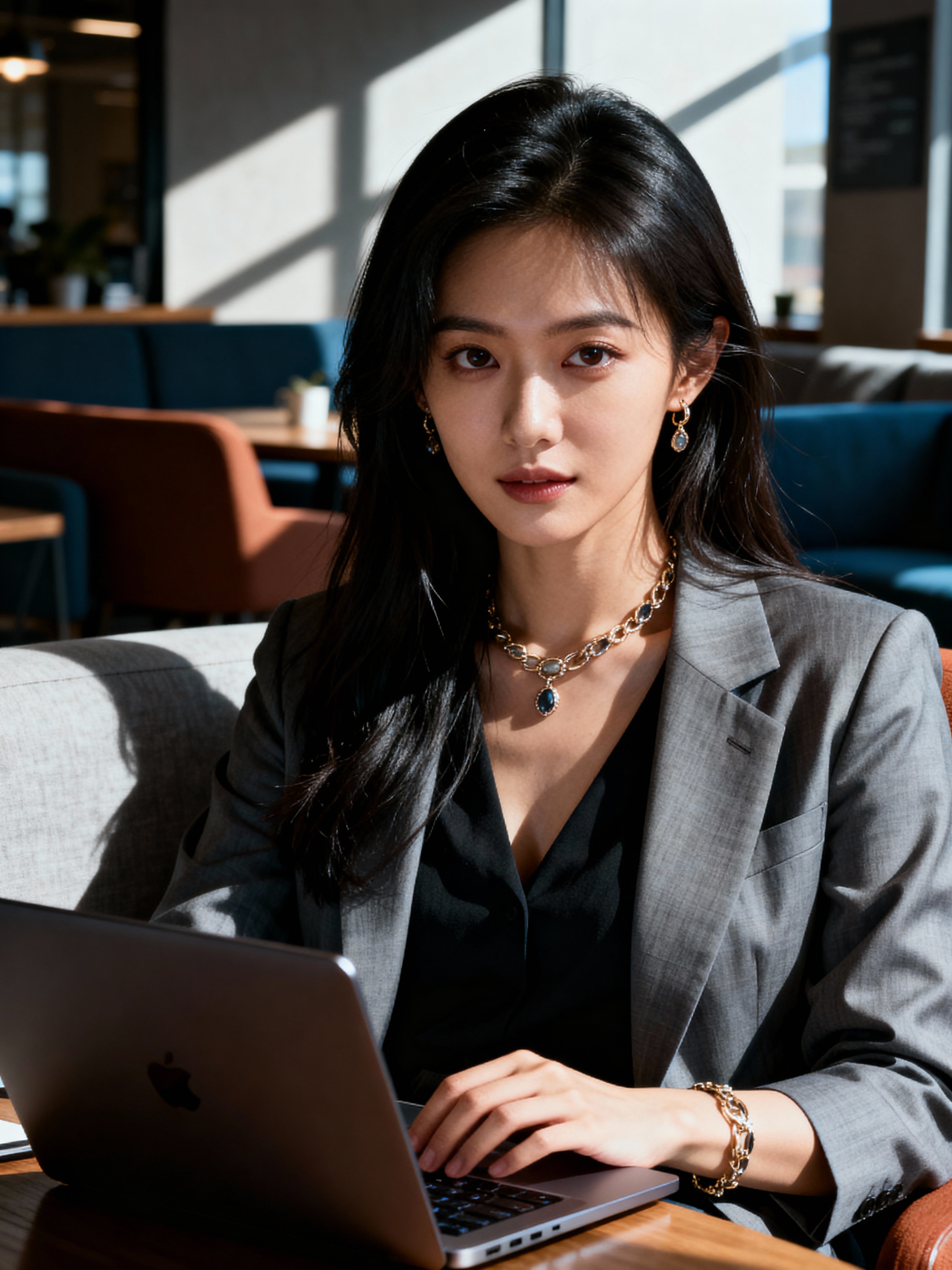 strategic model wearing contemporary business casual ensemble with tasteful jewelry coworking space lounge area, engaged with laptop