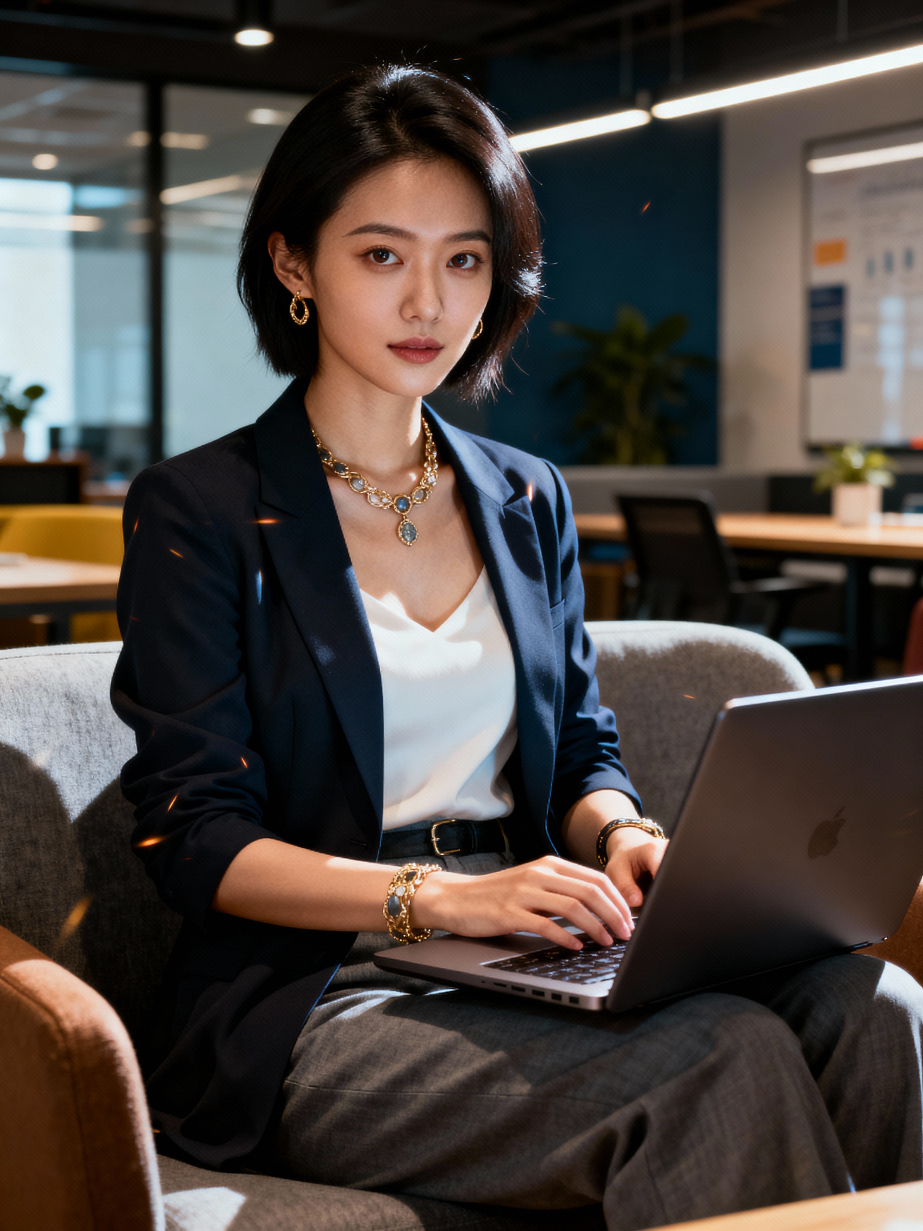 strategic model wearing contemporary business casual ensemble with tasteful jewelry coworking space lounge area, engaged with laptop