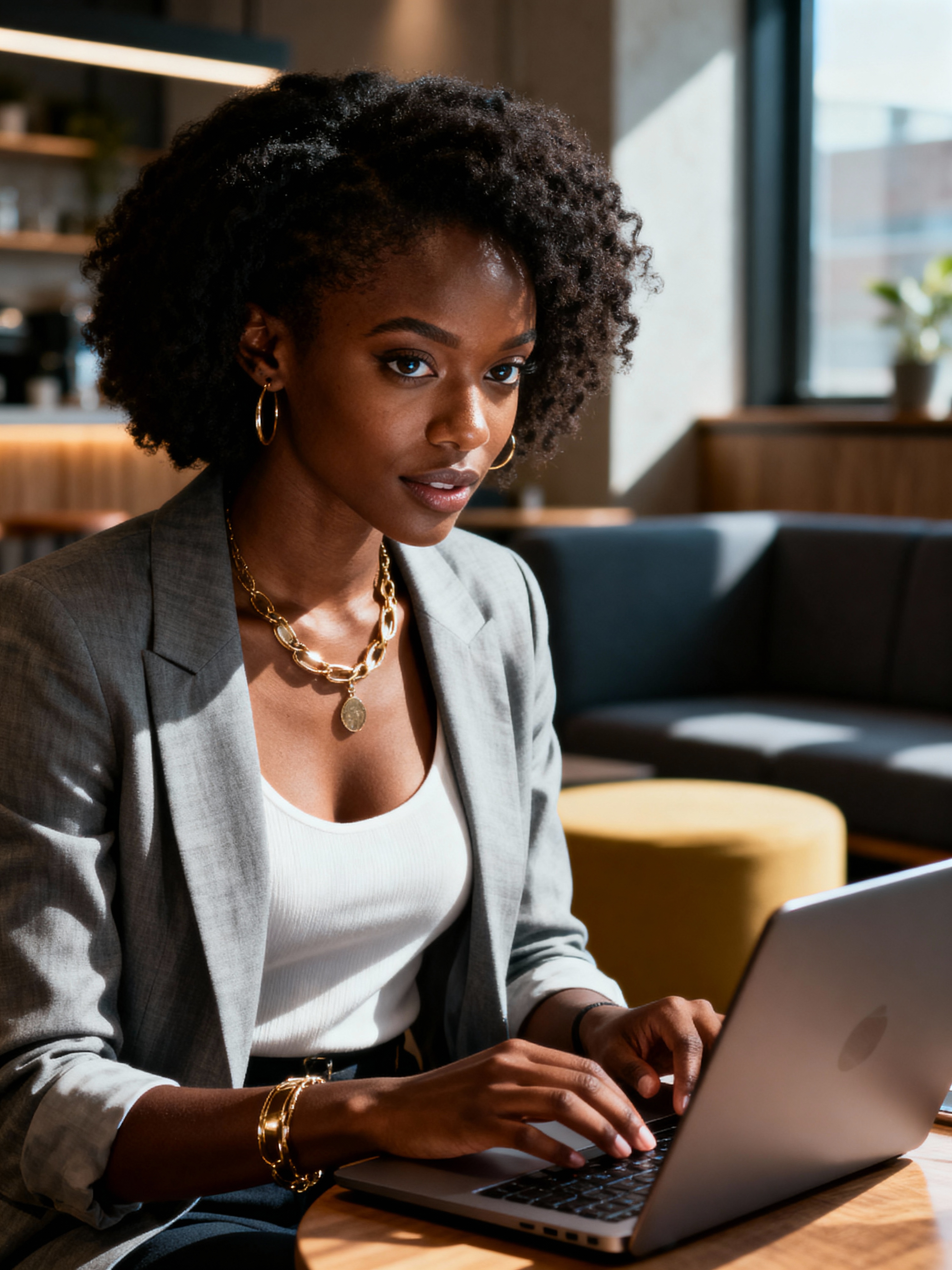 strategic model wearing contemporary business casual ensemble with tasteful jewelry coworking space lounge area, engaged with laptop