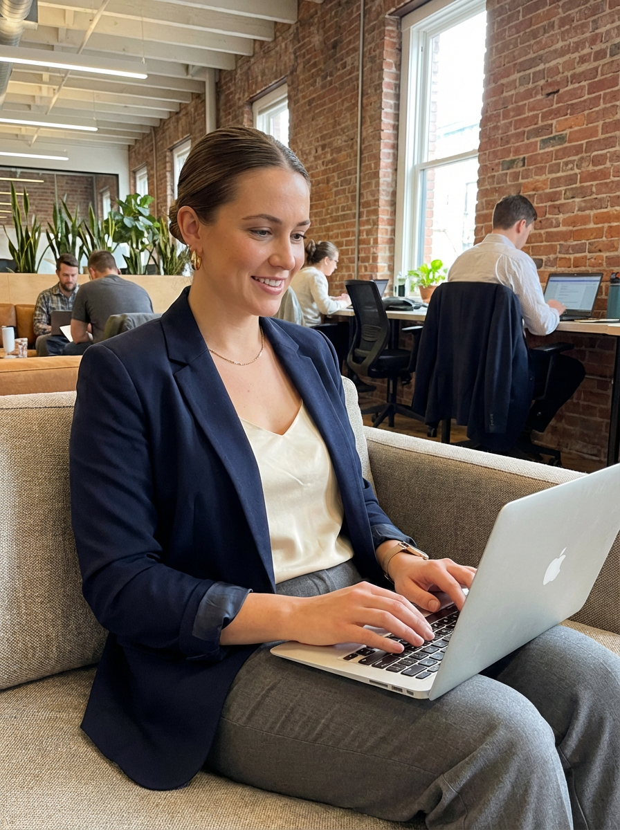 strategic model wearing contemporary business casual ensemble with tasteful jewelry coworking space lounge area, engaged with laptop