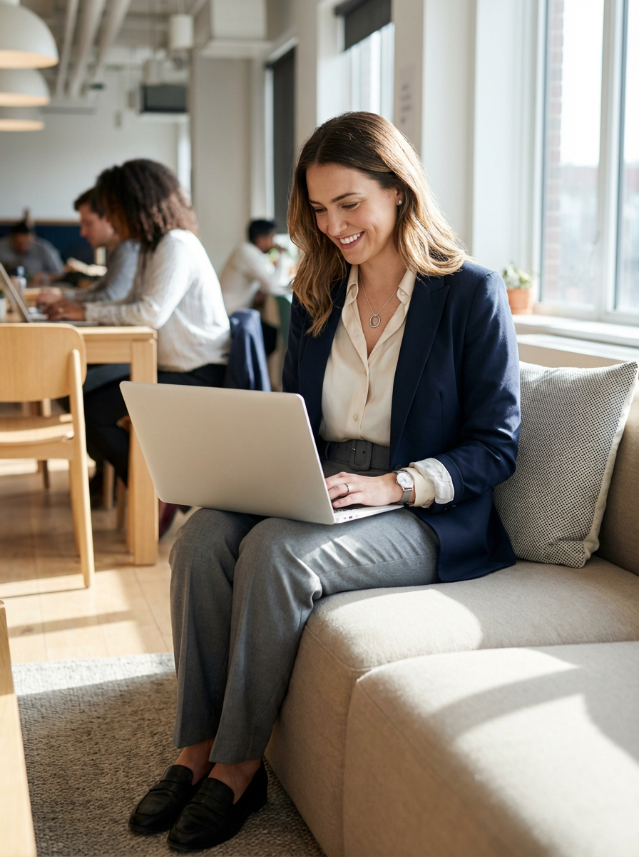 strategic model wearing contemporary business casual ensemble with tasteful jewelry coworking space lounge area, engaged with laptop