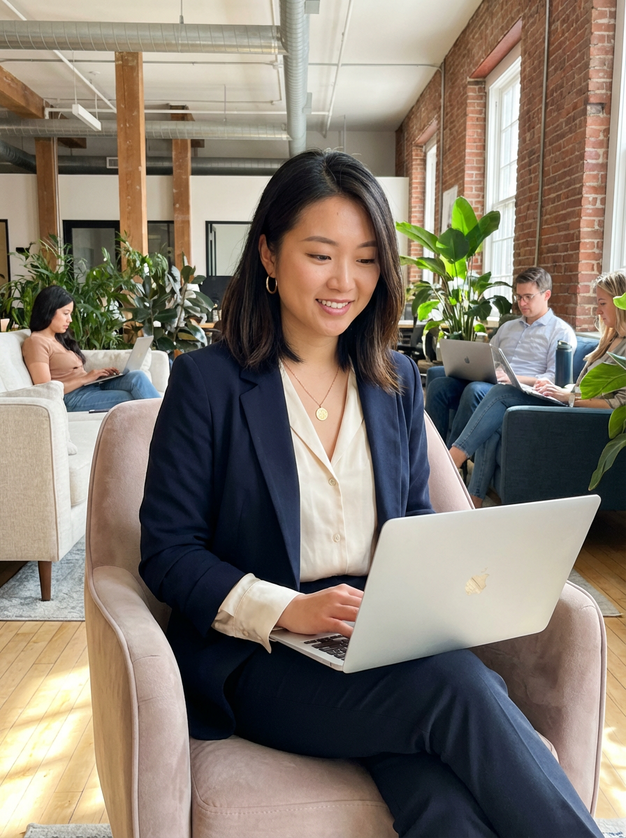 strategic model wearing contemporary business casual ensemble with tasteful jewelry coworking space lounge area, engaged with laptop